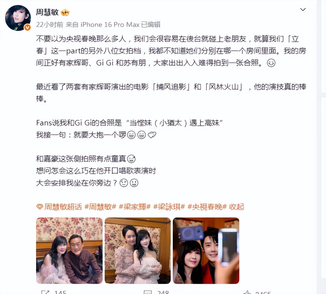 周慧敏在社交平台感慨:“大家出出入入难得拍到一张合照”,侧面印证了后台的忙碌。