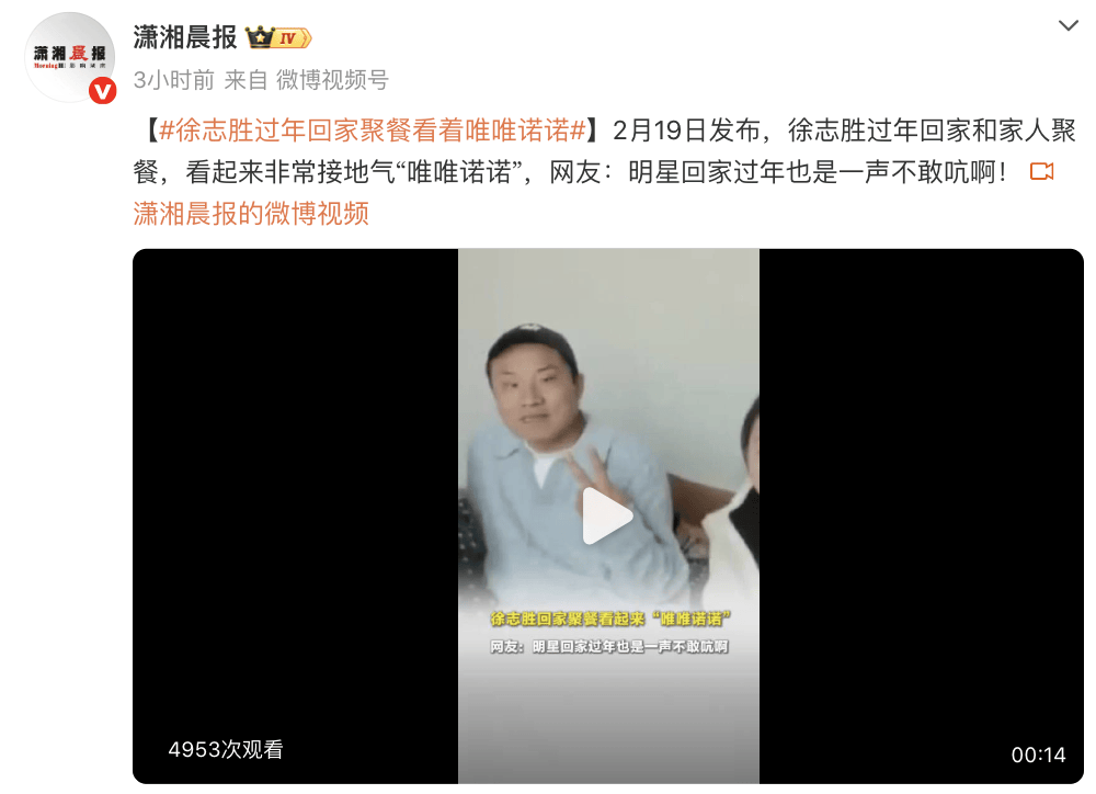 2月19日发布,徐志胜过年回家和家人聚餐,看起来非常接地气“唯唯诺诺”,网友:明星回家过年也是一声不敢吭啊!