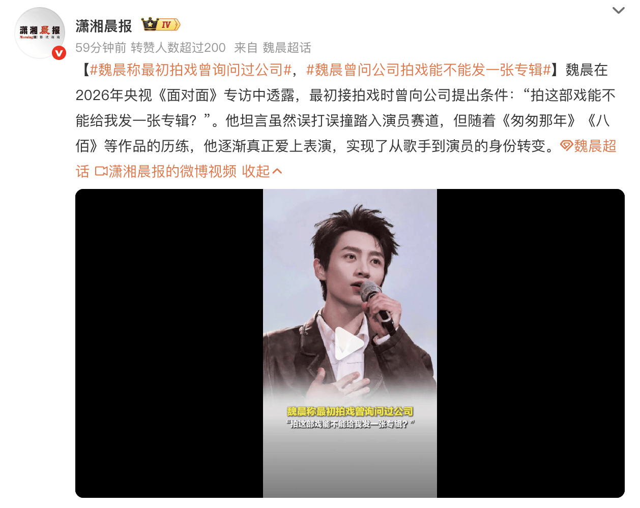 魏晨在2026年央视《面对面》专访中透露,最初接拍戏时曾向公司提出条件:“拍这部戏能不能给我发一张专辑?”。他坦言虽然误打误撞踏入演员赛道,但随着《匆匆那年》《八佰》等作品的历练,他逐渐真正爱上表演,实现了从歌手到演员的身份转变。