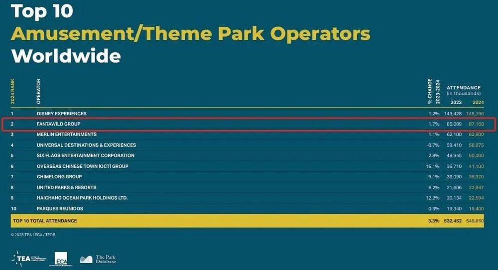 据TEA数据,2024-2025年,华强方特主题乐园的游客接待量,均位居全球第二,仅次于迪士尼。
