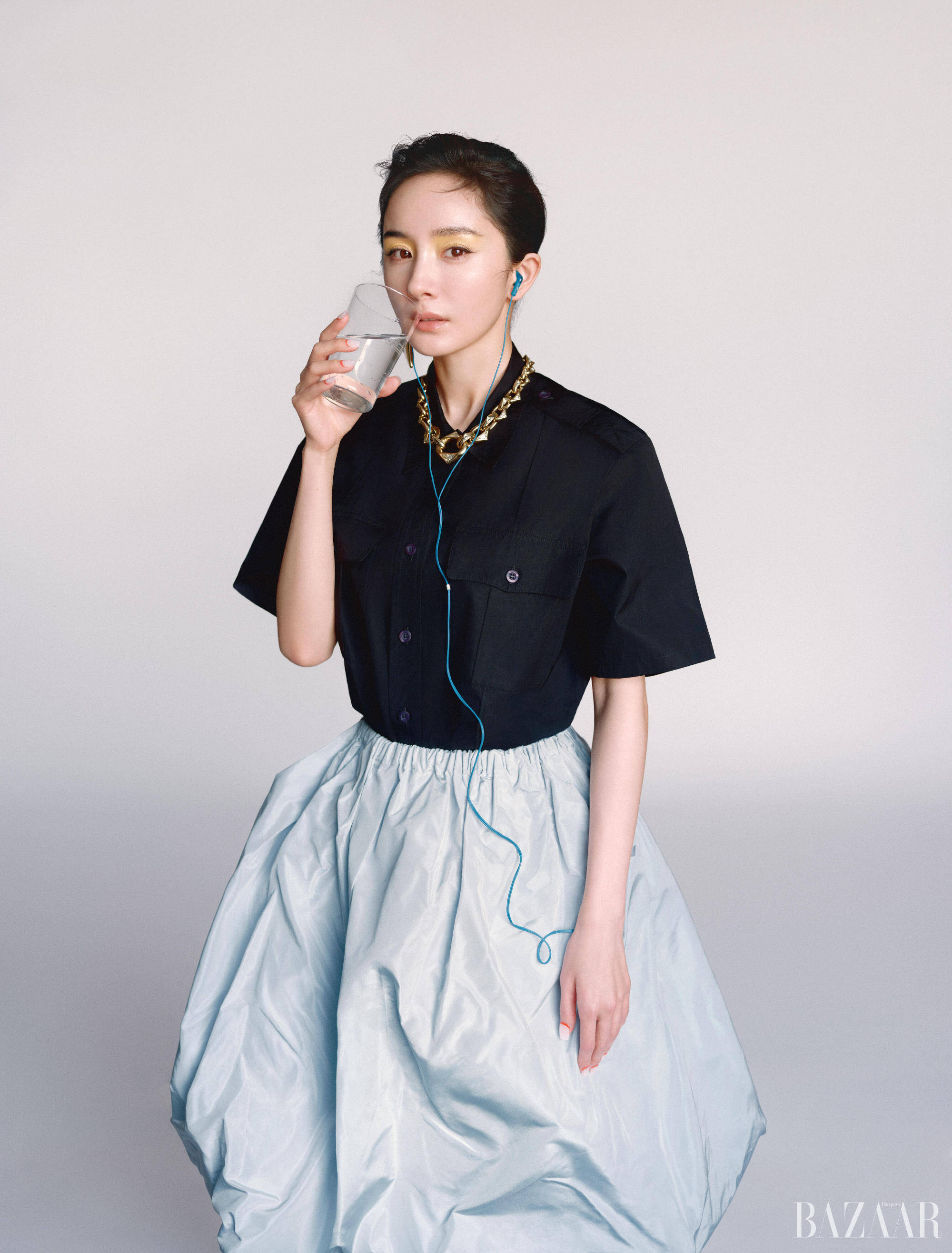 杨幂手持水杯,眼妆亮眼,气质清冷又个性。