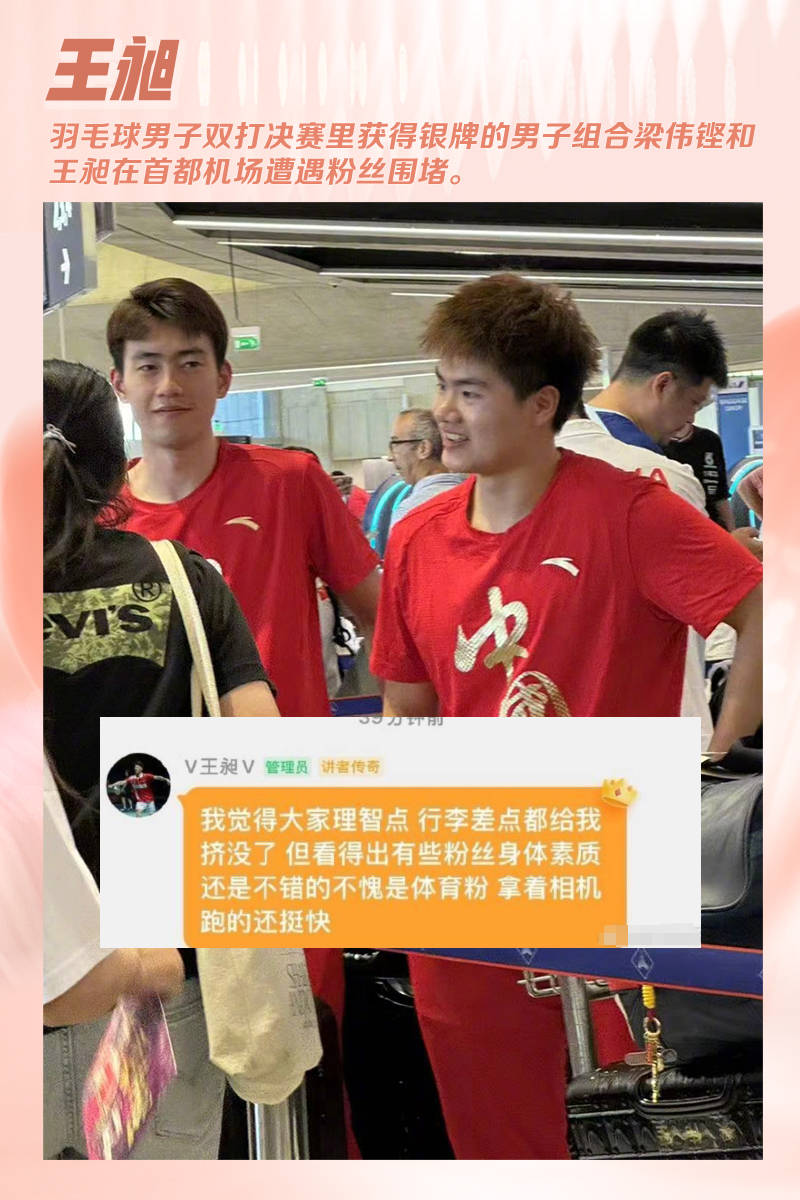 在巴黎奥运会羽毛球男子双打决赛里获得银牌的中国组合梁伟铿和王昶在首都机场遭遇围堵,两人在机场行走艰难,事后王昶在球迷群里发声表示“但看得出有些粉丝身体素质还是不错的,不愧是体育粉,拿着相机跑得还挺快”