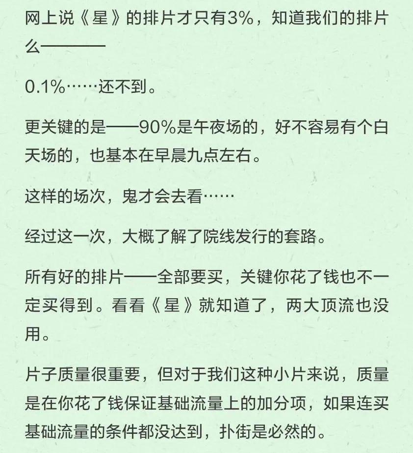 创作的电影第一次上院线就喜提扑街,《消失的我》编剧也是躺平了,爆起料来没轻没重的,直接就表示院线排片都有套路,好的排片全部要买,关键是有时候花钱也买不到,就像《星河入梦》,找了流量加持也没有用。