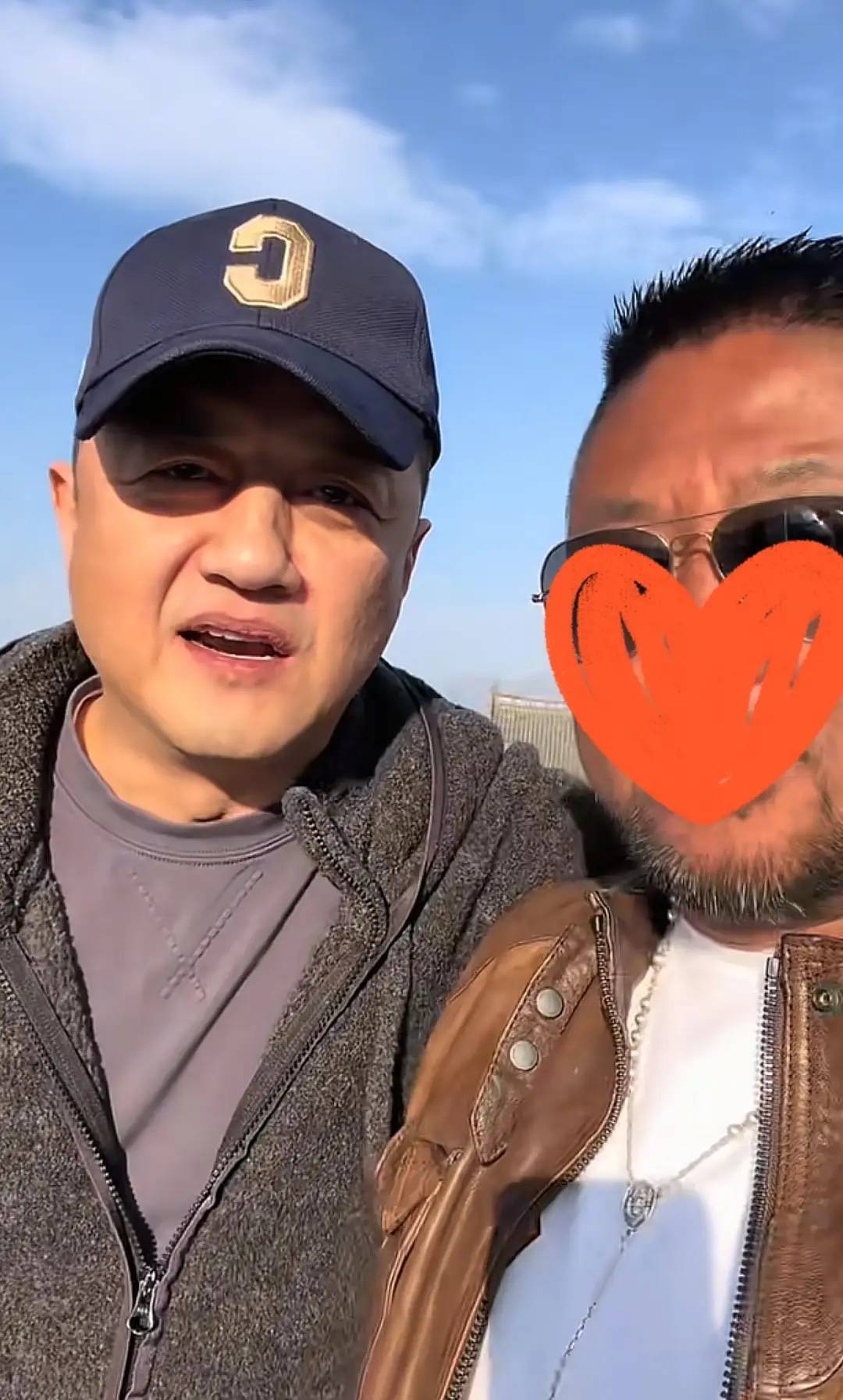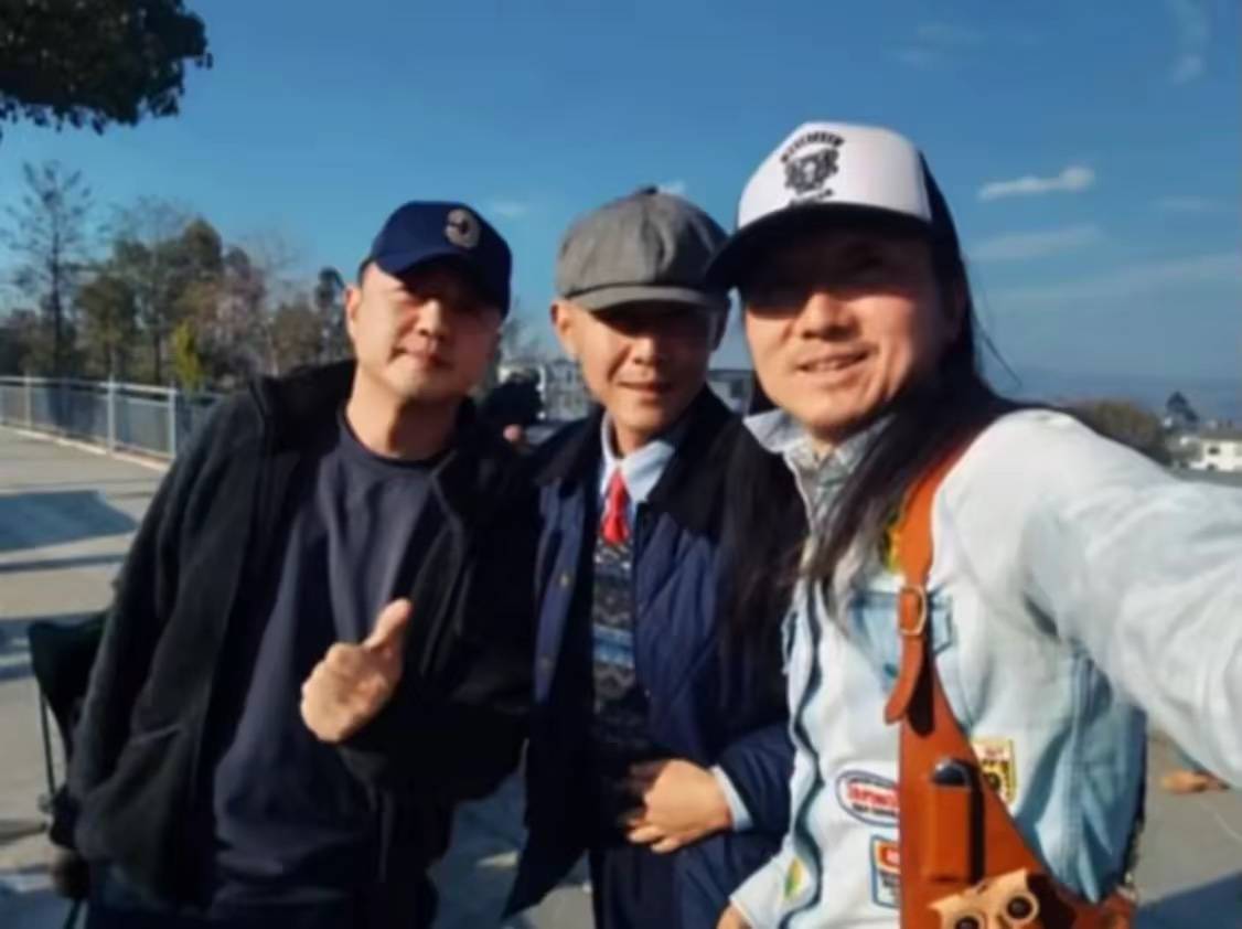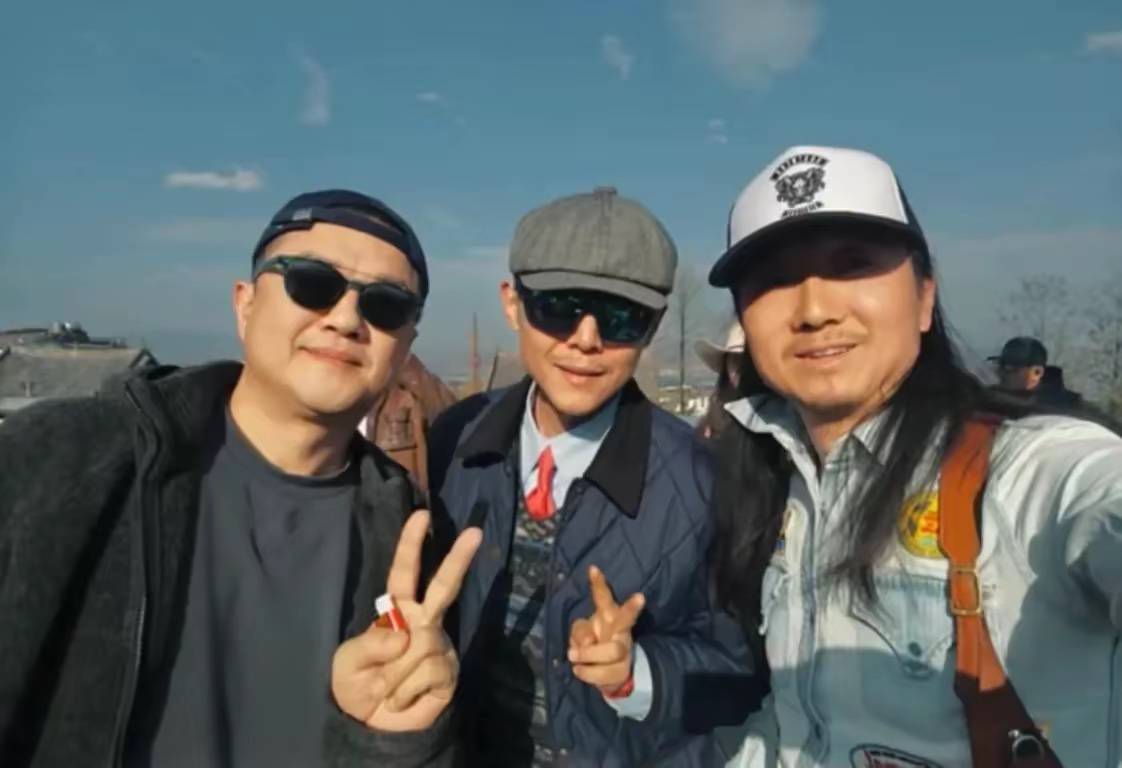 李亚鹏和网红大冰一起合影,大冰戴着八角帽、穿着一件藏蓝色绗缝夹克外套,他的打扮更具文艺范,像是一位流浪艺人。