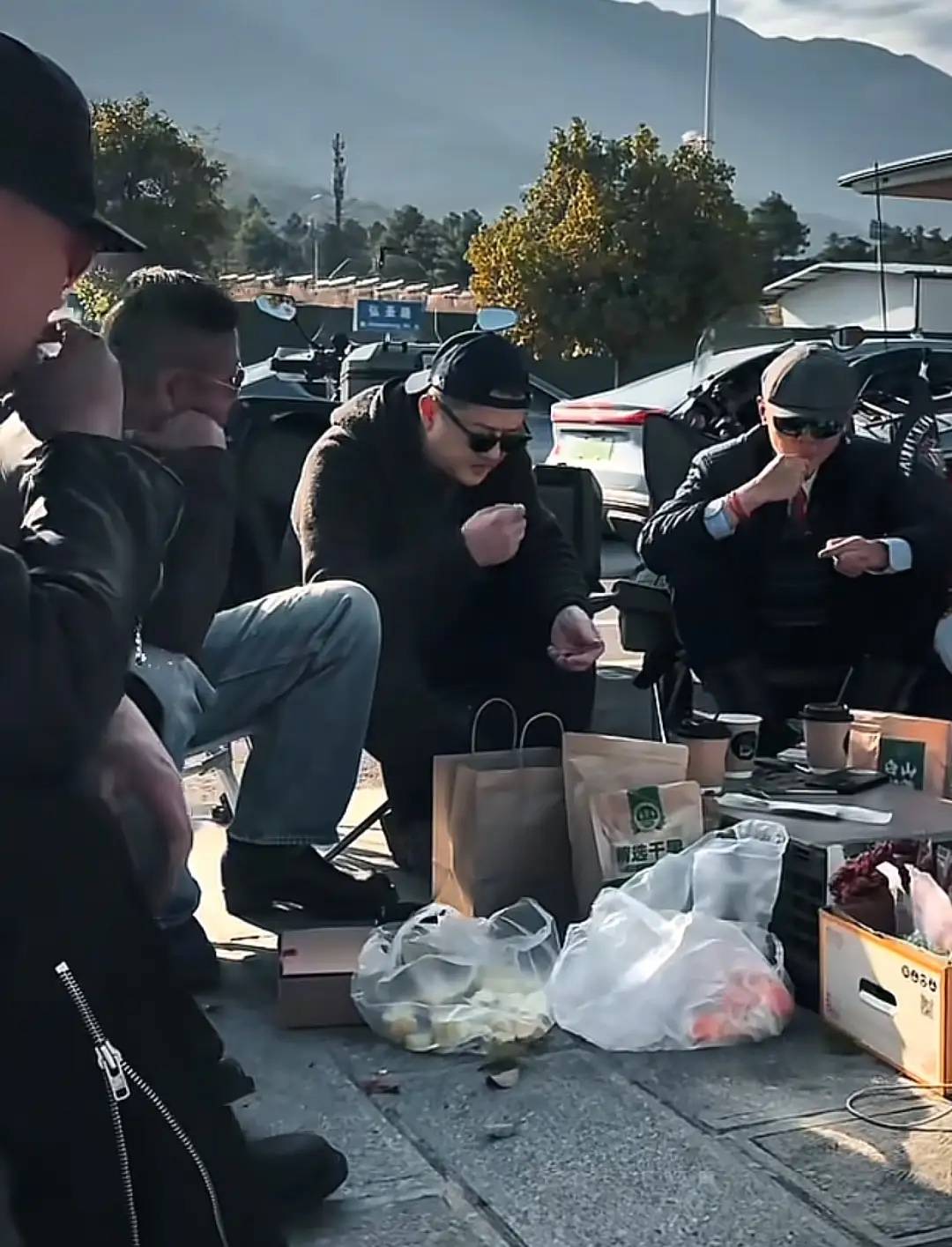 他们一行人在街边嗑瓜子、喝咖啡、晒太阳、聊天。云南的紫外线还是非常强,大家都戴着墨镜。