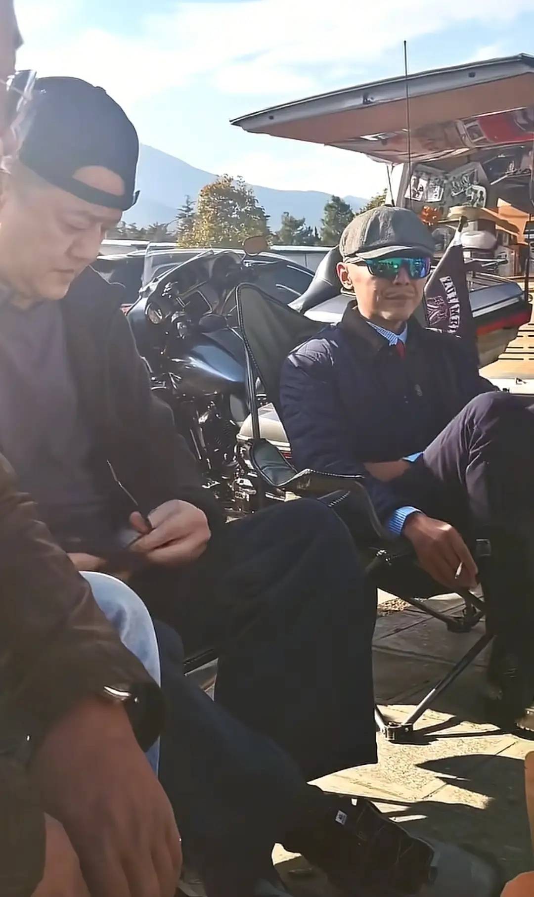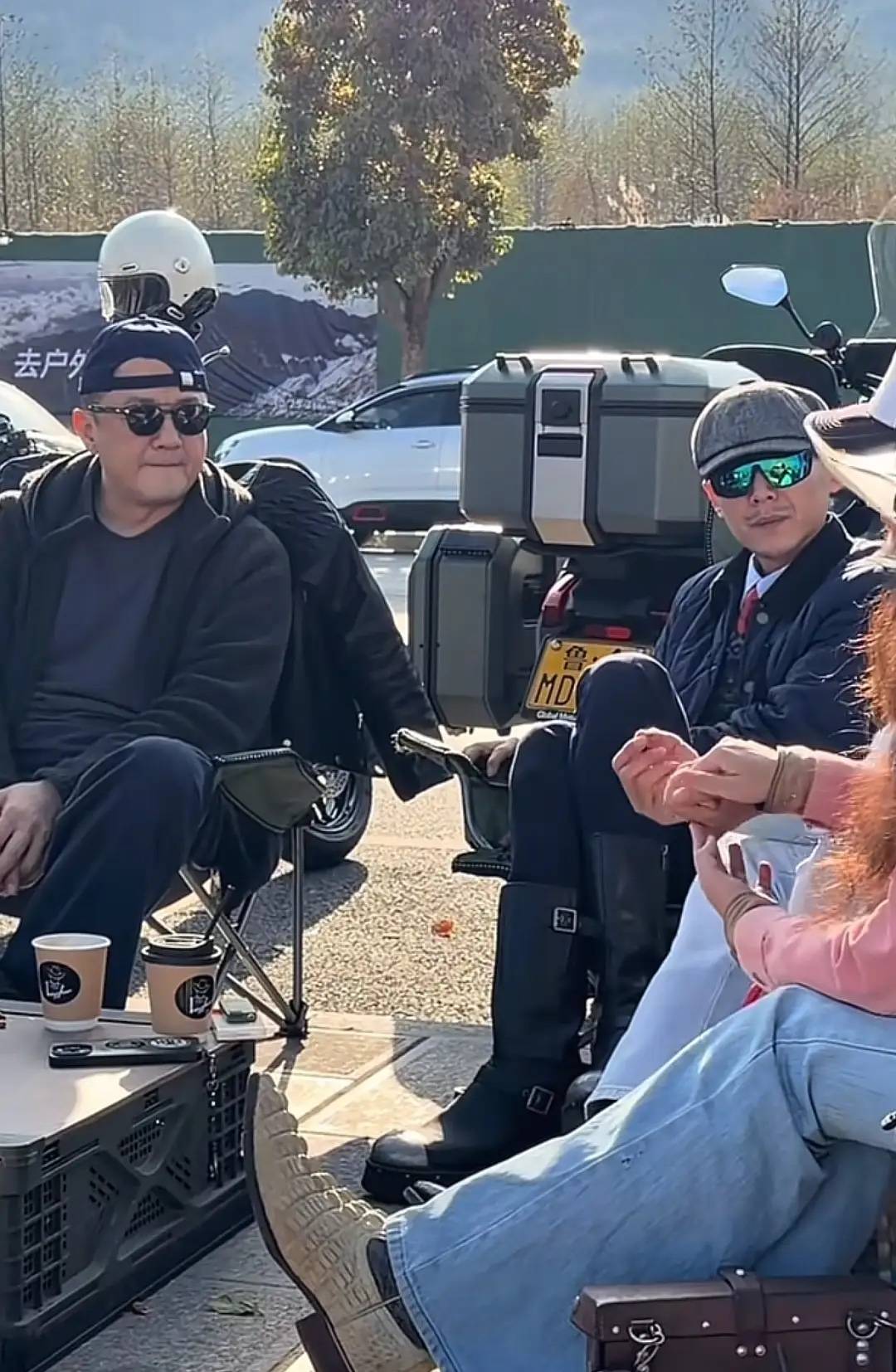 他们几个人坐在露营椅上,大冰还穿着机车靴、翘着二郎腿,他这个状态太像流浪艺人了,果然是心中同时装下了诗和远方。