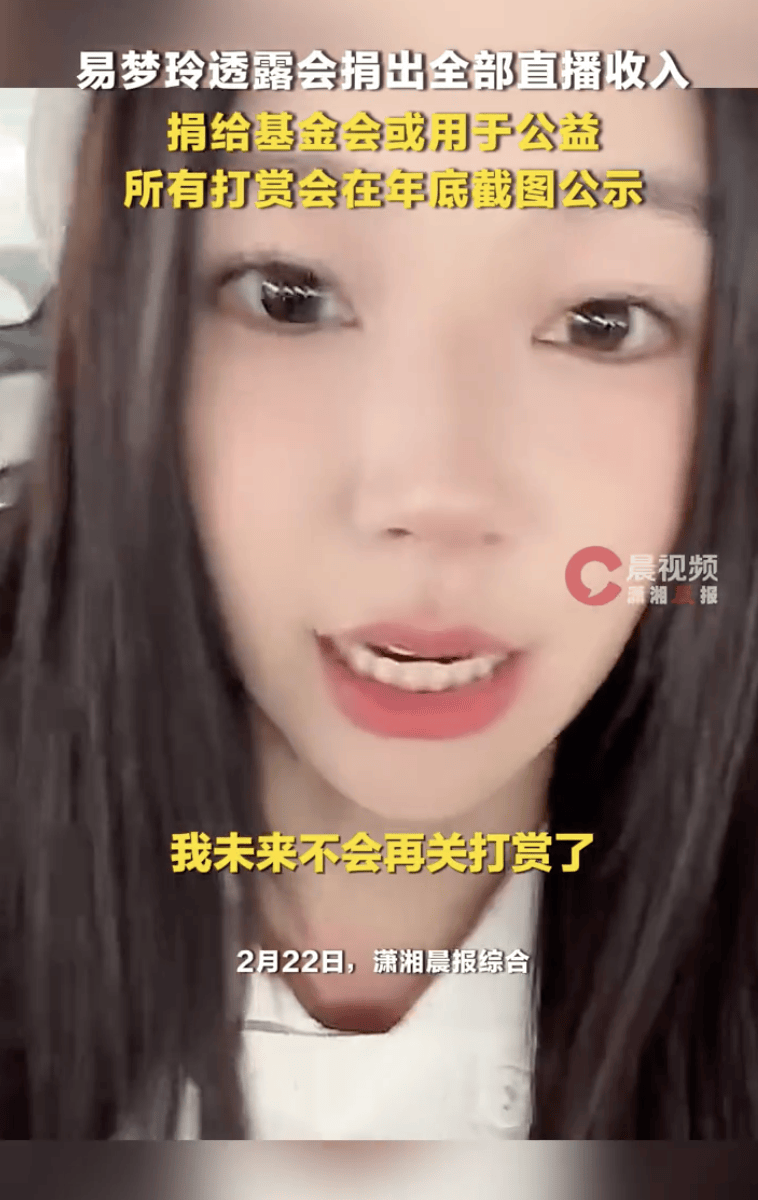 2月22日,网红易梦玲在某平台直播中宣布不再关闭打赏功能,并承诺将全部直播收入用于公益事业。她表示,所有打赏所得将在年底截图公示,并捐给基金会或帮助有需要的人,表示:“我不需要赚这个钱,给需要的人。”