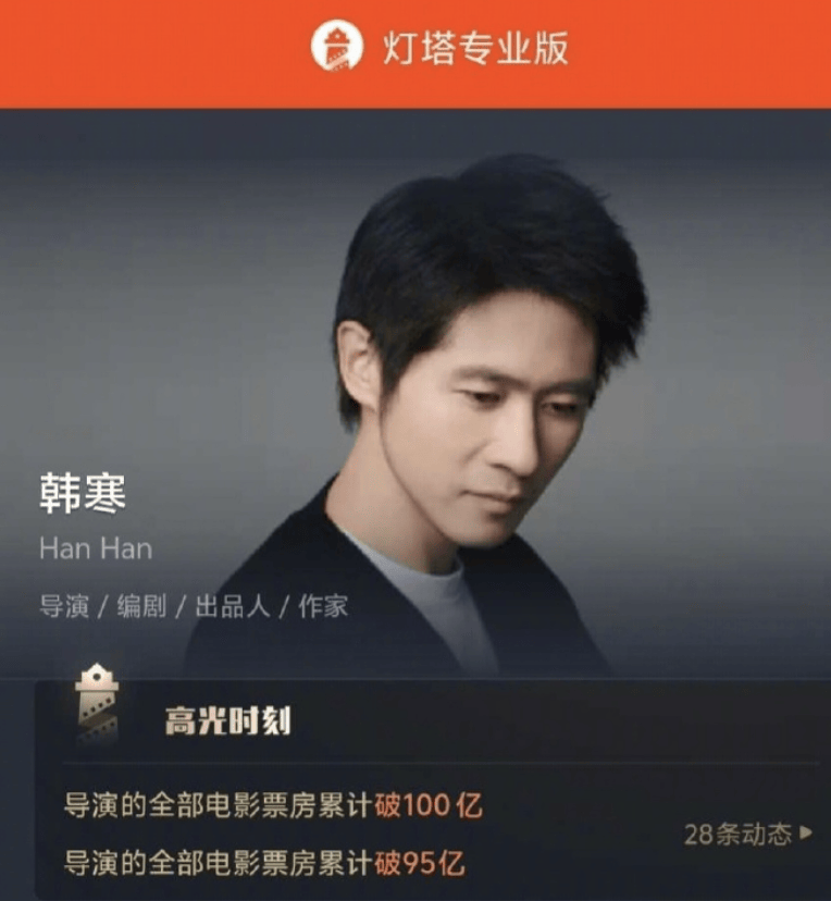 搜狐娱乐讯 据灯塔专业版数据,韩寒导演电影累计票房已破100亿,作品包括《乘风破浪》《飞驰人生》系列等。