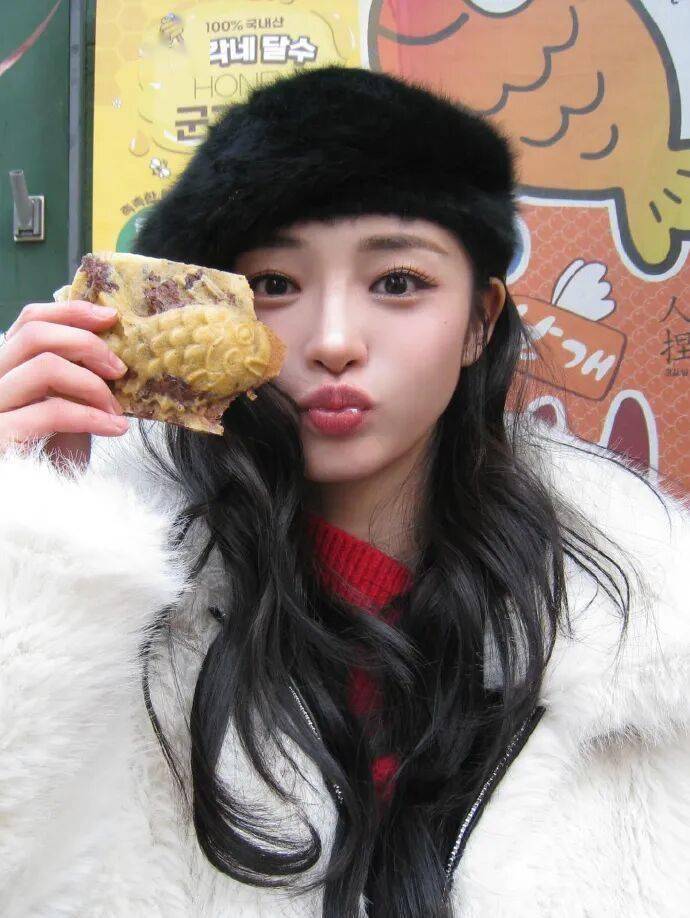 正因如此,周洁琼在首尔的踪迹才显得格外耐人寻味。社交媒体上流传的照片中,她头戴贝雷帽,身着红色针织衫,以清新优雅的冬日造型面对镜头。此外,她手持街头热卖的鲫鱼饼微笑、在本地餐厅用餐的生活片段,都清晰印证了她正在首尔停留。这与之前“无法参与”的官方说法形成了微妙反差。