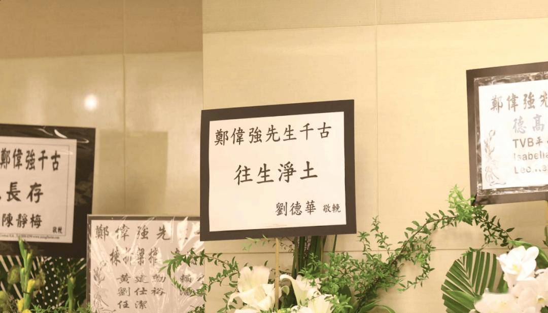郑伟强家人一早到场打点,灵堂布置清雅简洁,遗照两旁摆满白色鲜花。不少艺人及名人都送上花牌悼念,包括周润发与太太陈荟莲,刘德华、苗侨伟、郑则仕、郑少秋、汤镇业、关菊英等人。