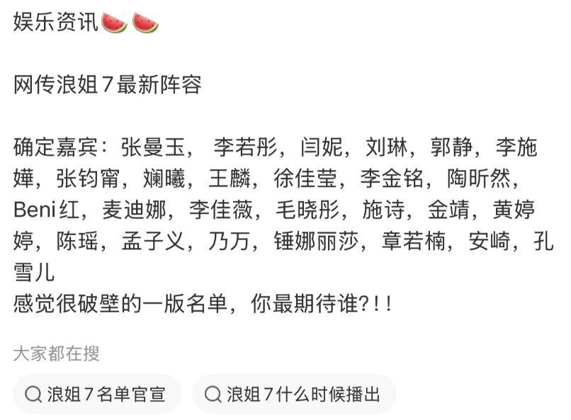 而在《浪姐7》录制之前,自然又网传出了新一季阵容:乃万的名字也在其中。