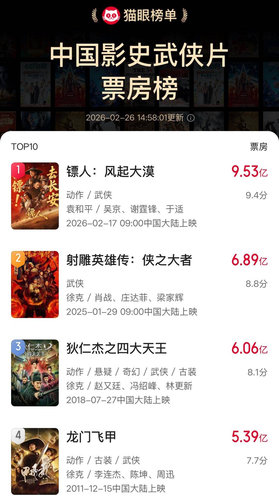 中国影史武侠片票房榜,图据猫眼专业版
