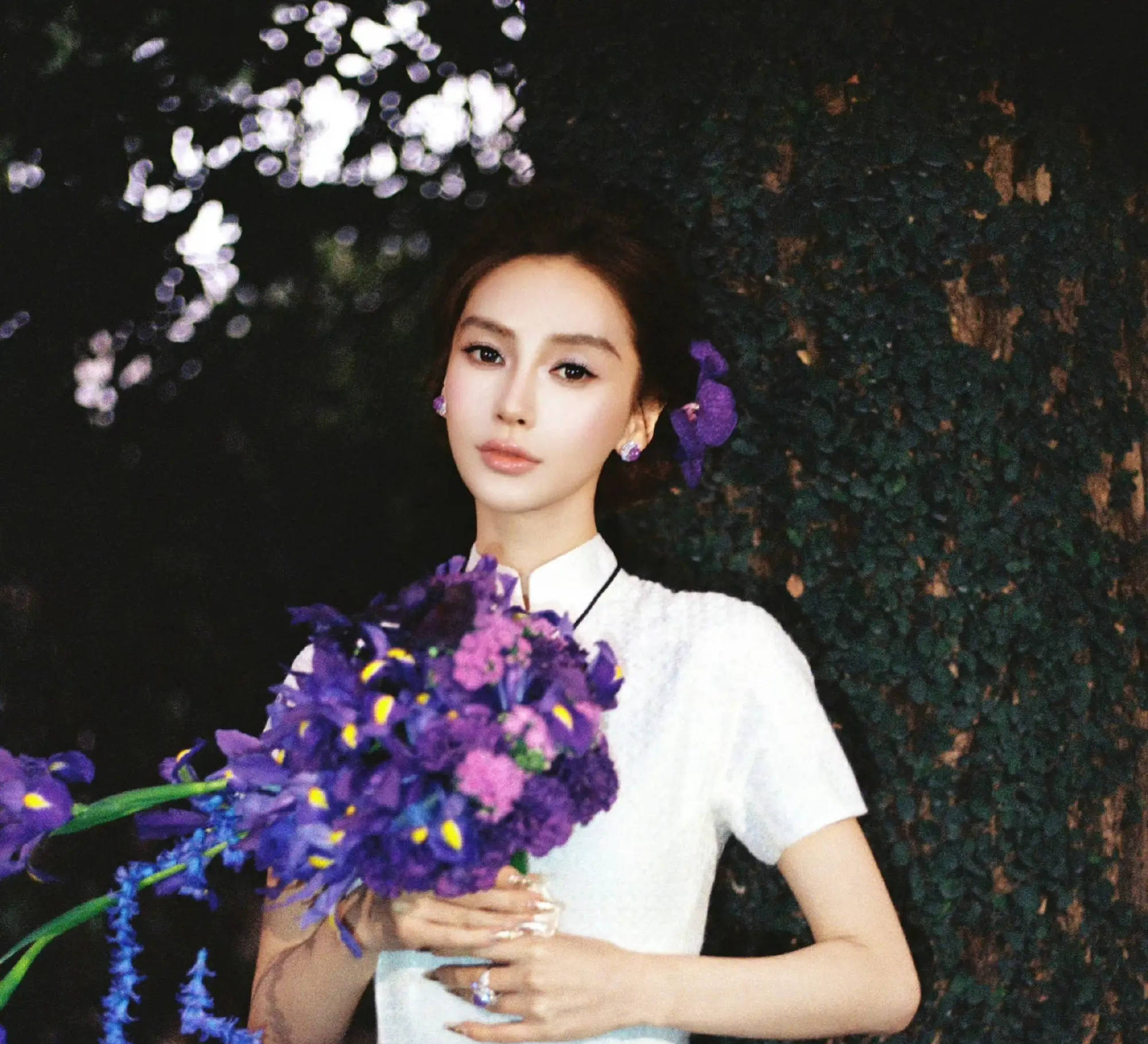 搜狐娱乐讯 近日,杨颖一组写真曝光。她着白裙配紫花,盘发与卷发造型切换,清雅又明艳。
