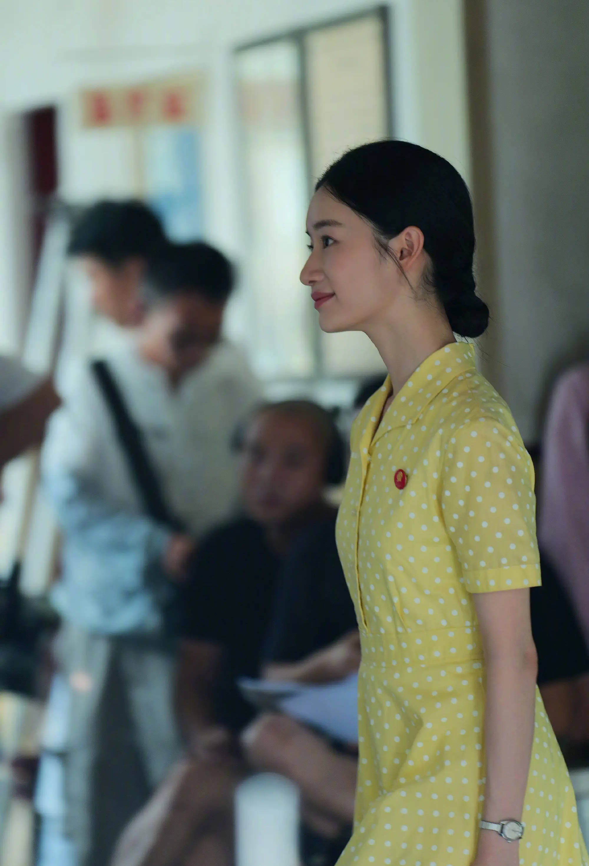 郭晓婷身着黄底白点连衣裙,在人群中侧行浅笑,气质清新又灵动。