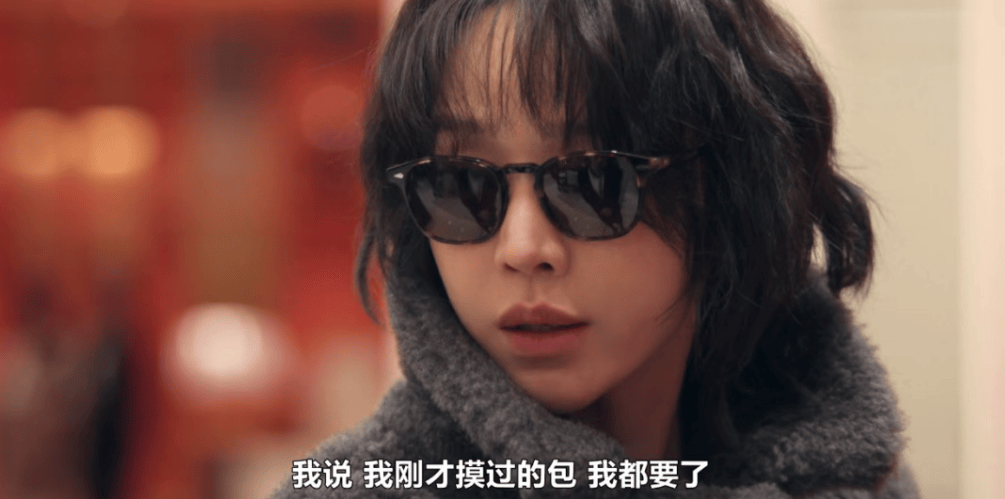 莎拉一副吊儿郎当的模样,不顾店员阻拦,对着昂贵的包包又摸又拍照。