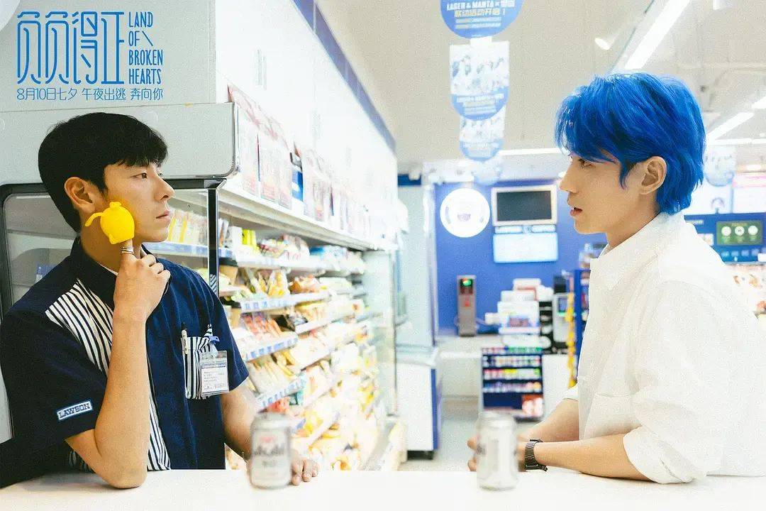 首先是视觉。《负负得正》走的是世界独立电影里常用的“仿胶片”路线,画面质感轻柔迷幻;朱一龙的蓝发造型,邱天宛如《重庆森林》中王菲、《偷心》中娜塔莉·波特曼附体的“索女”装扮,两人间飘忽、朦胧的亲密场景,以及无处不在的细小视觉元素,更是把电影的视觉观感构建成了统一的电波系风格,随便一截就是一张能发Ins的“文艺照”。