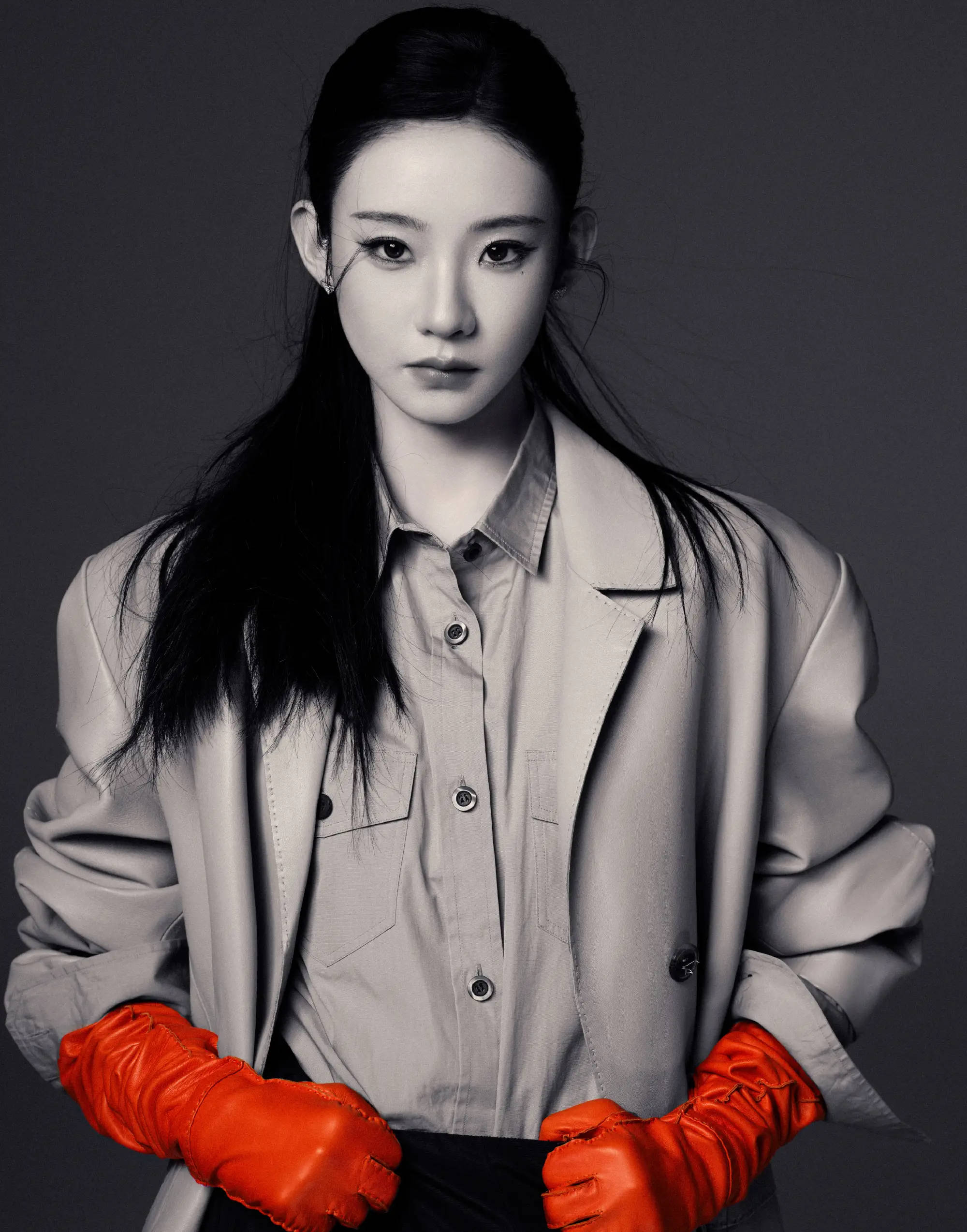 张艺凡身着浅灰大衣,搭配橙红手套,直视镜头,冷艳又充满力量感。