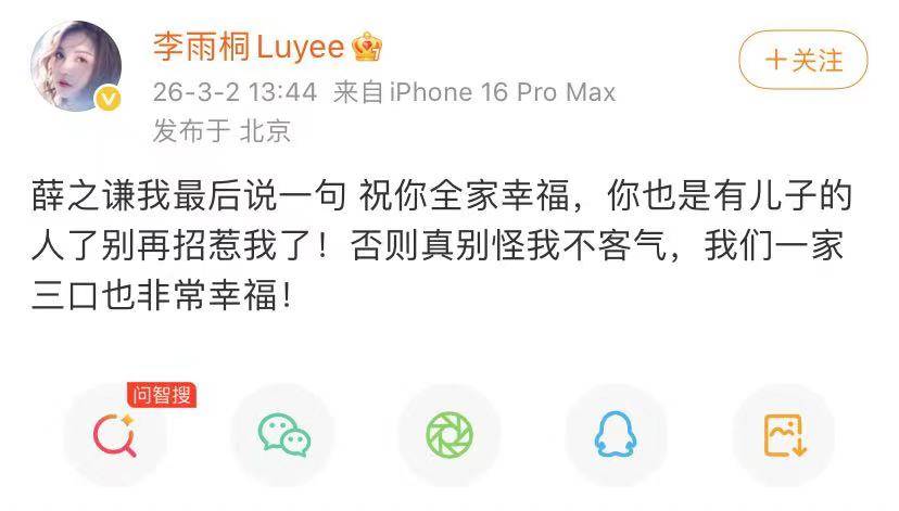 2026年3月2日,李雨桐连发多条微博,实名@薛之谦,放出狠话:“今天我就一个个公开所有的真相……君子报仇,十年不晚”。她提出多项具体诉求: