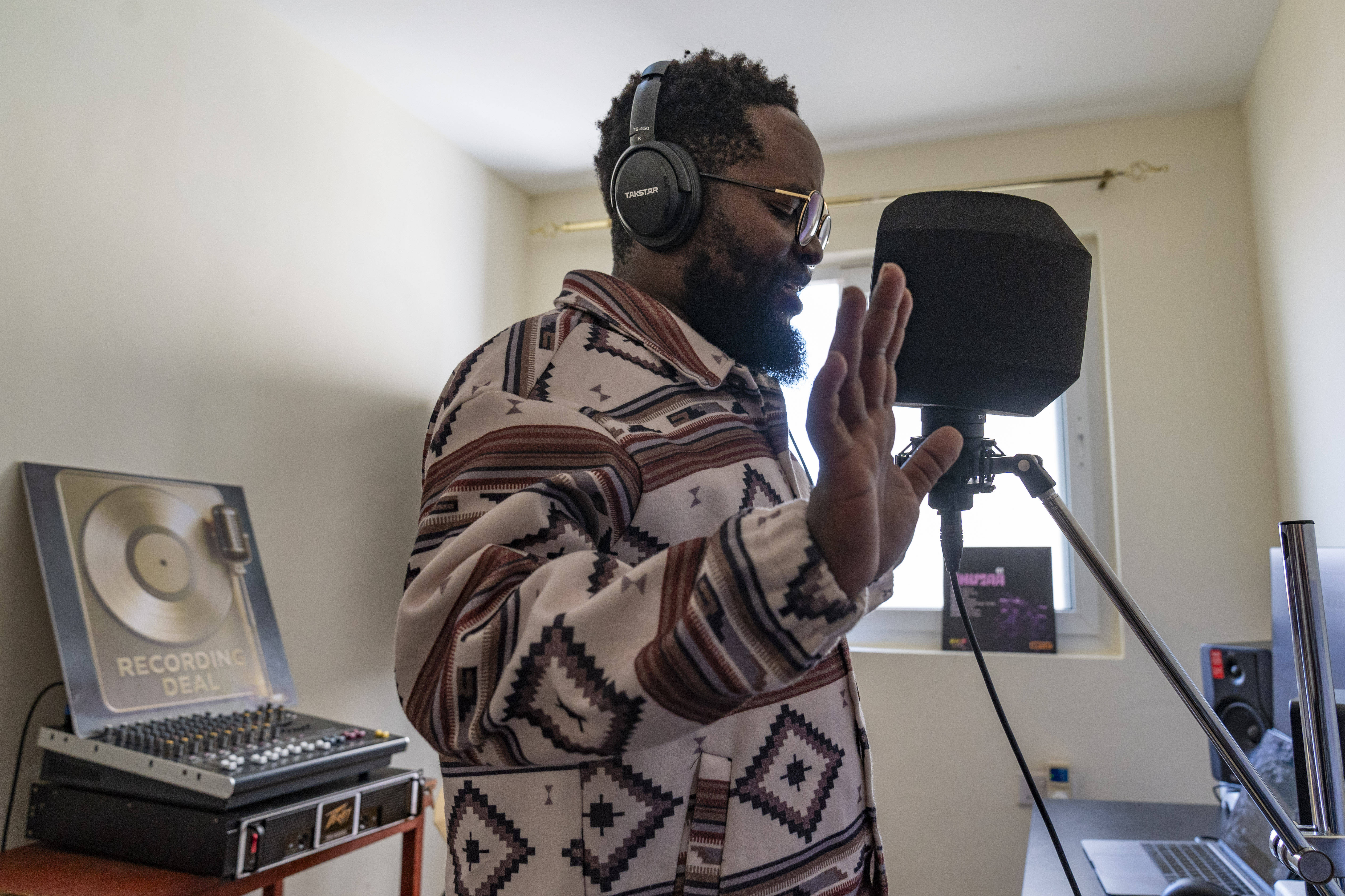 在肯尼亚卡贾多郡,法努埃尔在家中练歌(2026年1月16日摄)。