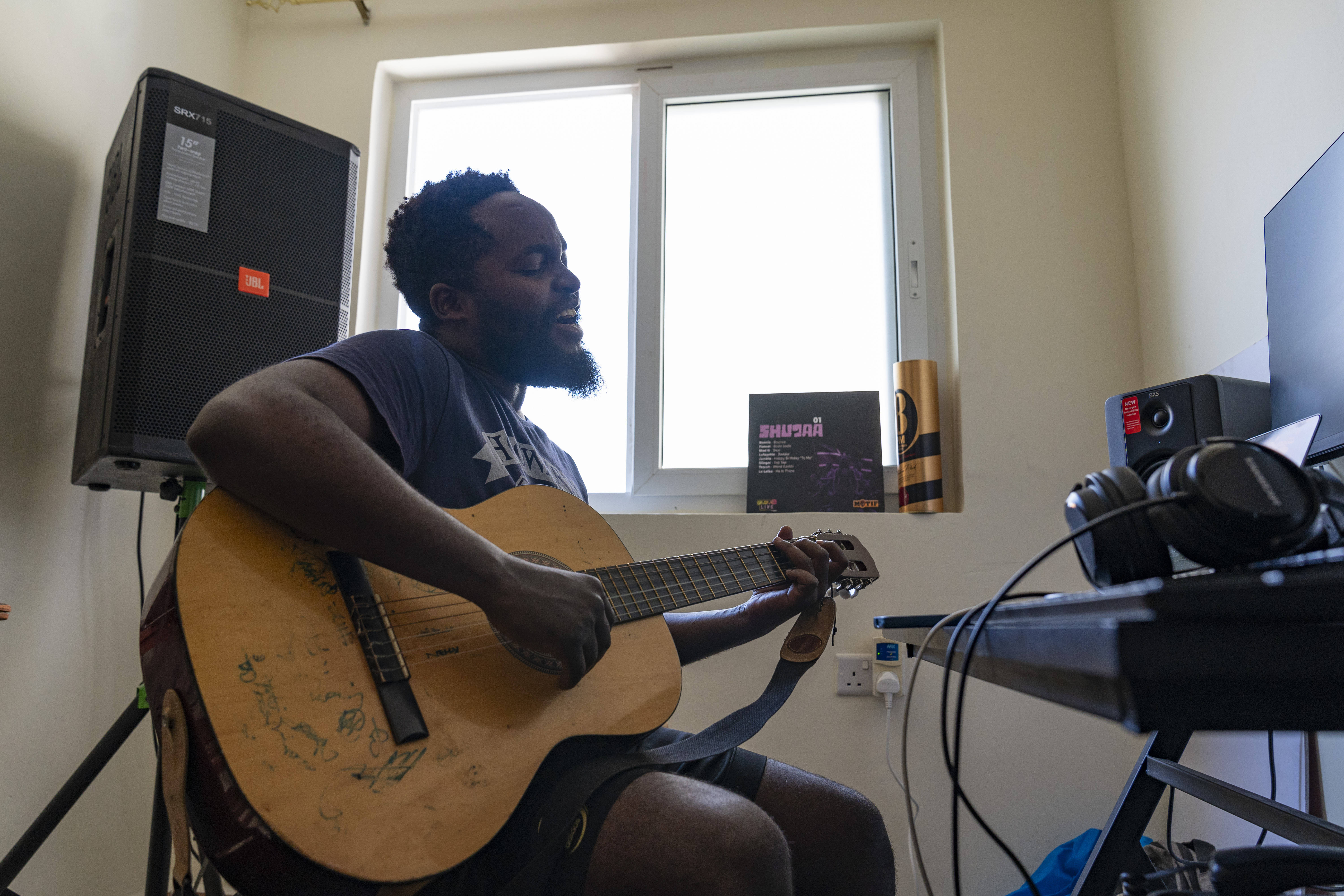 在肯尼亚卡贾多郡,法努埃尔在家里弹吉他练歌(2026年1月16日摄)。