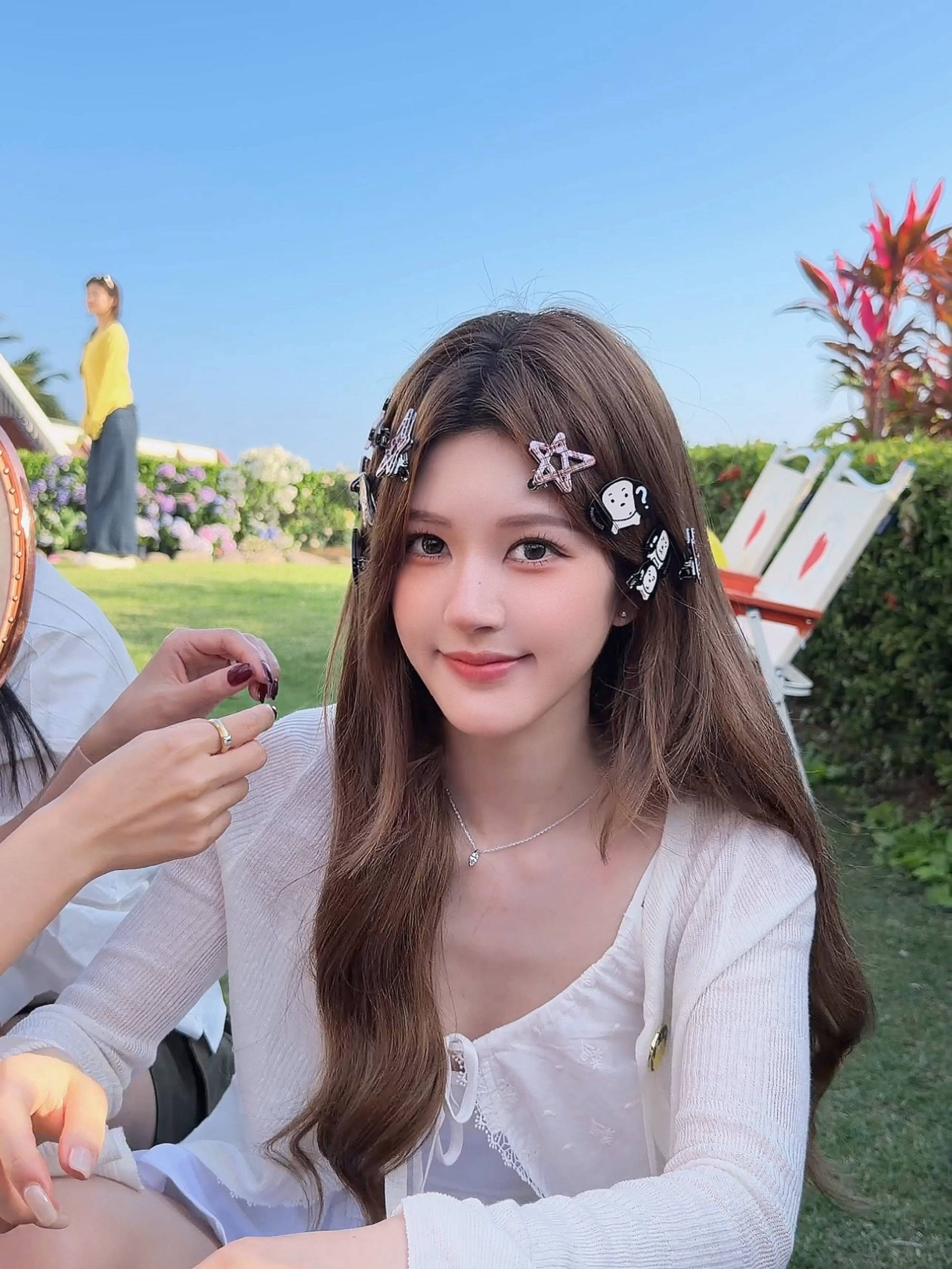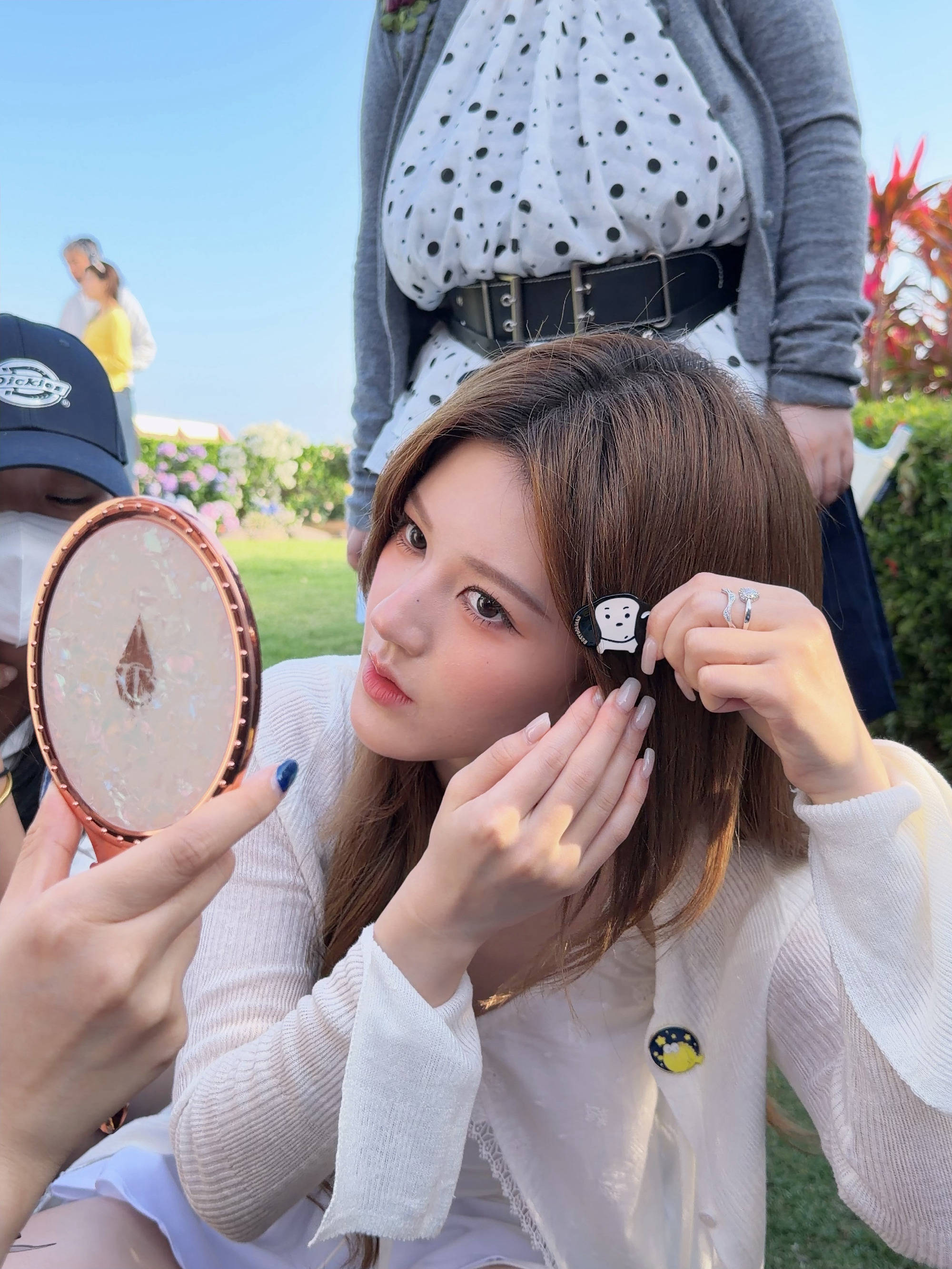 赵露思手持化妆镜整理发夹,侧头凝视镜头,灵动可爱。