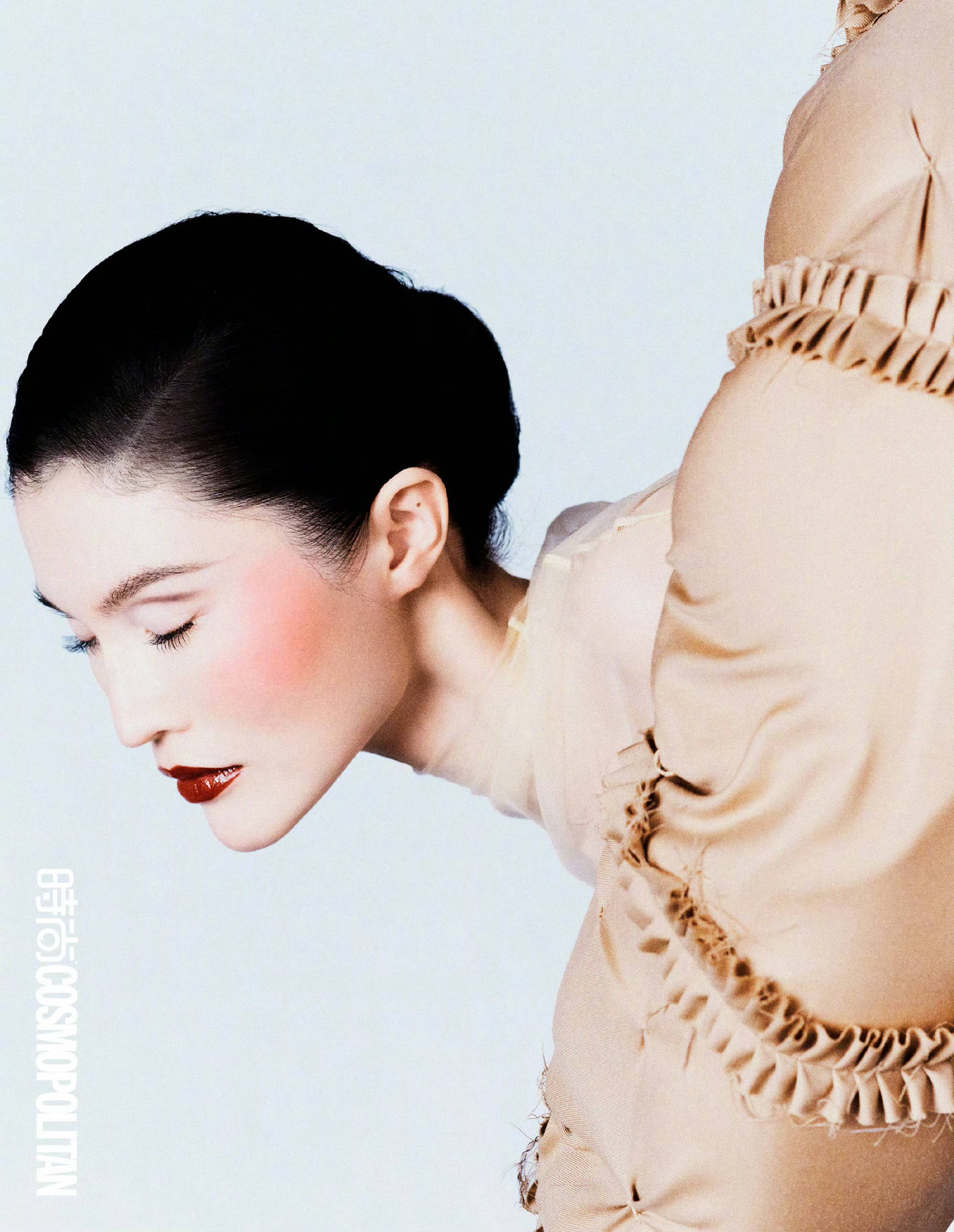 何穗垂眸,裸色纱裙配腮红温柔。