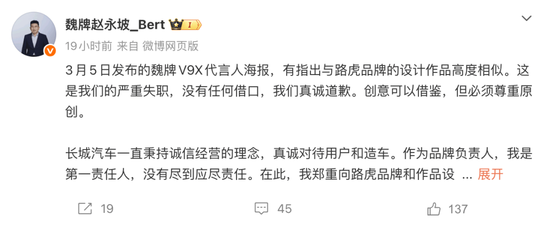 3月5日,魏牌V9X官宣由魏建军亲自出镜代言,结果海报刚发出去,就被人一眼认出几乎照着路虎揽胜运动版的创意模板来拍。3月6日,魏建军公开承认“的确是抄袭”,愿承担法律和经济责任,相关素材也随即下架。3月7日,揽胜官方还给了一个体面的回应:坚持原创,祝长城越来越好。整个节奏,顺得不像翻车,更像排练过。