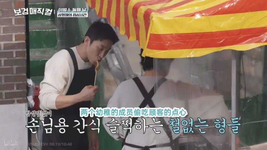 朴宝剑,给人的感觉一直是暖心体贴,但他也会因为郭东延为客人准备鱼饼汤太香,借口去店门口转转,躲在角落里偷吃鱼饼。有点内向的郭东延,看到朴宝剑和李相二偷吃鱼饼,顾不上还在准备中的午饭料理,举着食材就冲出去了。