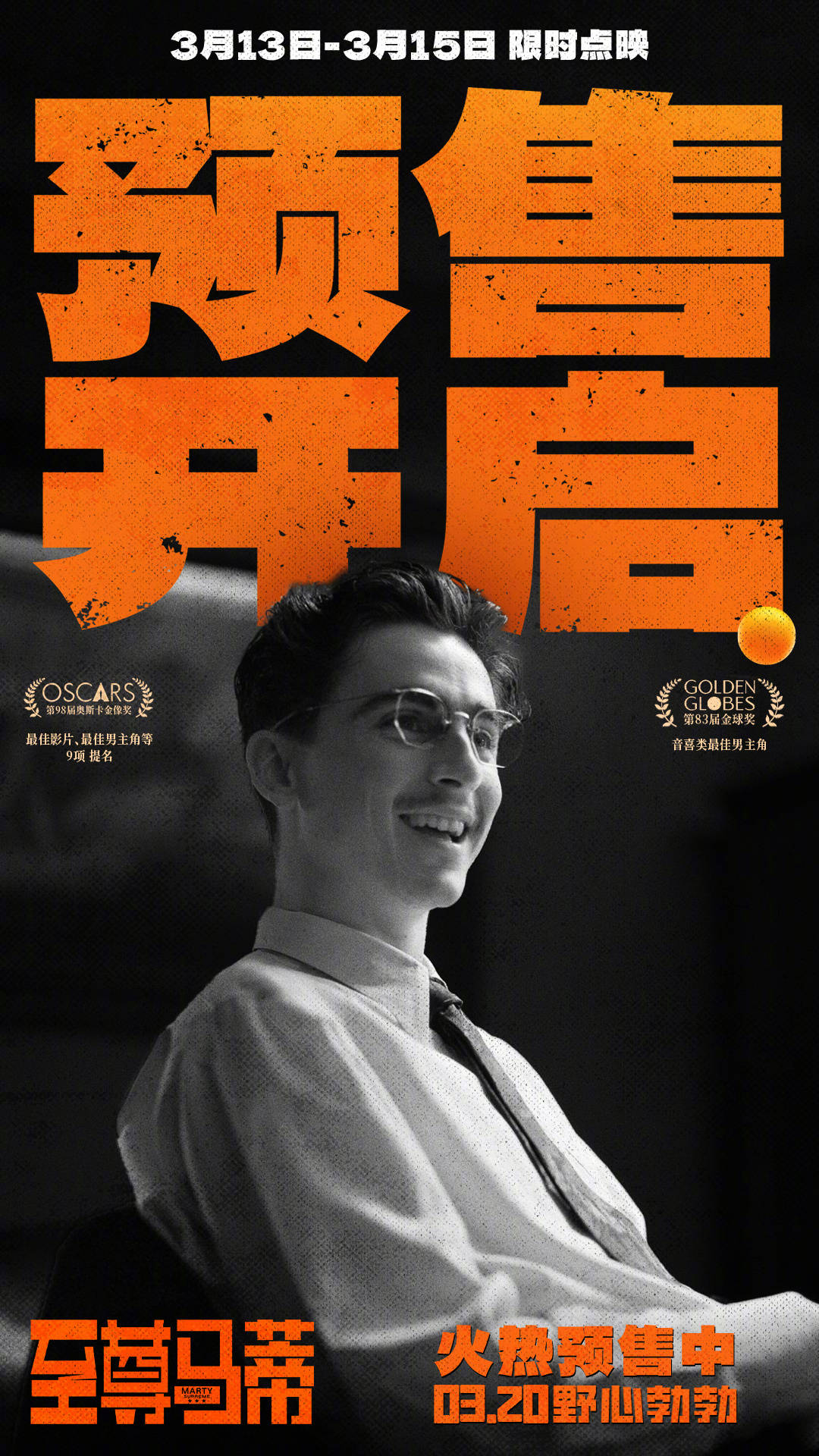 搜狐娱乐讯 今日,由“甜茶”提莫西·查拉梅主演,斩获奥斯卡9项重磅提名的电影《至尊马蒂》正式官宣开启预售,同时发布终极预告与海报,一场关于梦想、野心与命运的热血大戏即将上演。观众期待也随着主创来华的系列活动持续升温——为宣传新片,“甜茶”开启“抓马”中国行,在刚刚过去的周末空降成都与粉丝近距离互动,今天更将与导演一同亮相北京首映礼,与中国观众双向奔赴。影片将于3月13日18:00-22:00;3月14日-3月15日14:00-16:00,18:00-20:00 全国部分影城限时点映,3月20日正式上映。