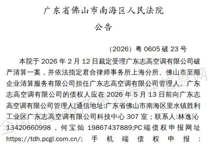公开资料显示,广东志高空调有限公司注册资本99614万元,目前核心资产包括佛山市南海区里水镇3处合计8.23万平方米的不动产,以及690枚商标、271项专利,根据法院公告,这些资产将由管理人依法处置用于清偿债务。本次破产清算申请人为上海栎钐企业管理有限公司,法院已指定君合律师事务所上海分所与佛山市至顺企业清算服务有限公司共同担任管理人。
