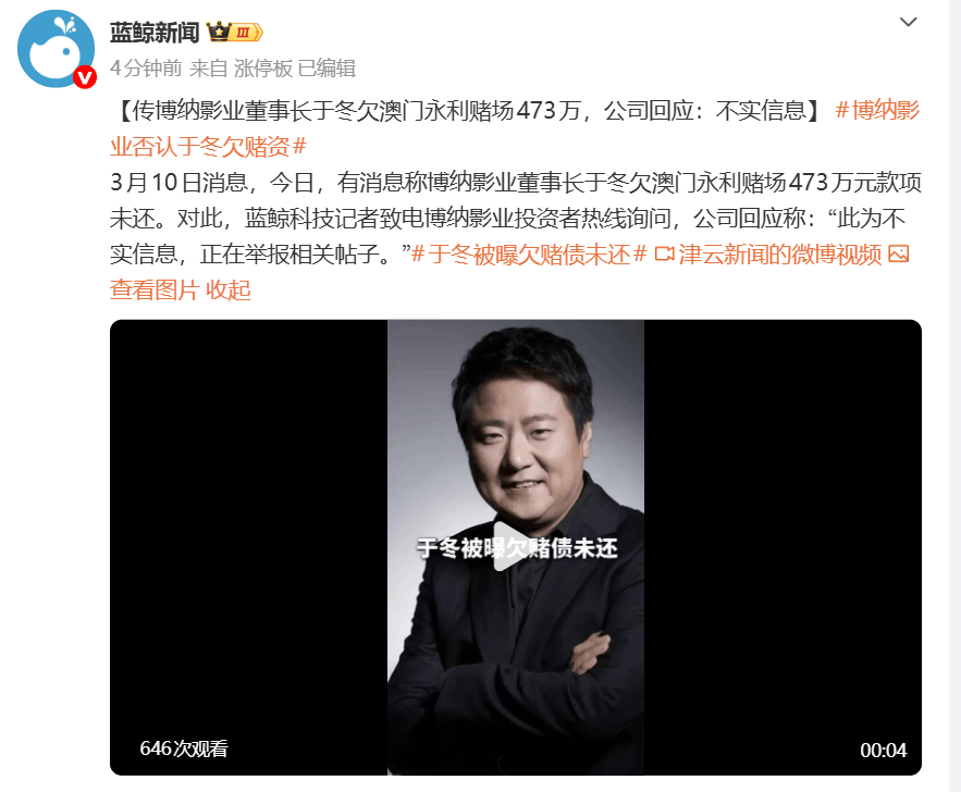 3月10日,针对于冬被曝欠赌债未还,记者致电博纳影业投资者热线询问,对方回应称:“此为不实信息,正在举报相关帖子。”