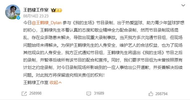 值得注意的是,当天人群拥挤,稍不注意就可能引起踩踏事件,录制节目现场像如此混乱的真的少见。而在该事发生后,王鹤棣工作室发长文宣传退出节目后续录制,还明确要求节目方道歉,完全不顾及会得罪平台,态度非常强硬。而《我的主场》节目组也在第一时间承认错误,并且向王鹤棣道歉了。
