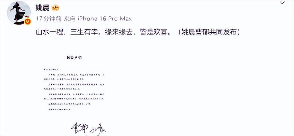 声明落款处,两人共同签署的字迹透着从容,字里行间没有怨怼与指责,只有对过往的珍视与对未来的约定。这场被外界视为 “分手范本” 的官宣,为一段长达十余年的情感关系,画上了温润而理性的句点。