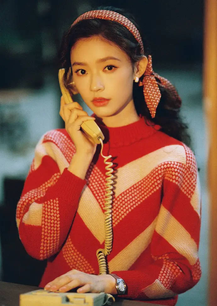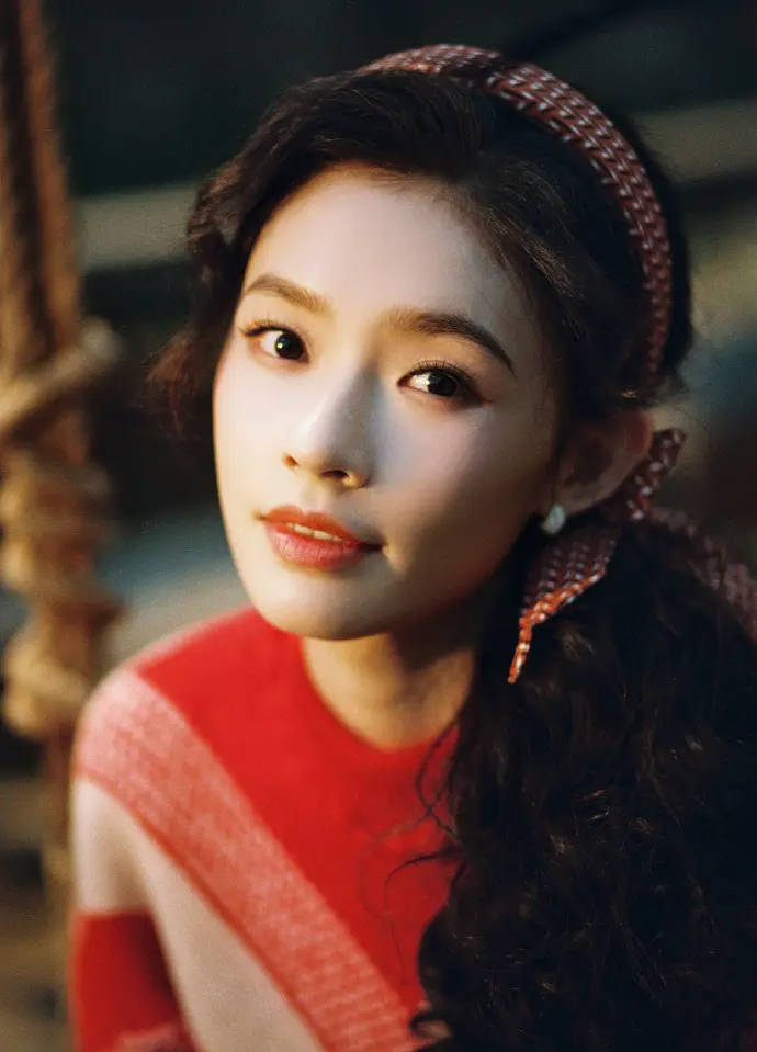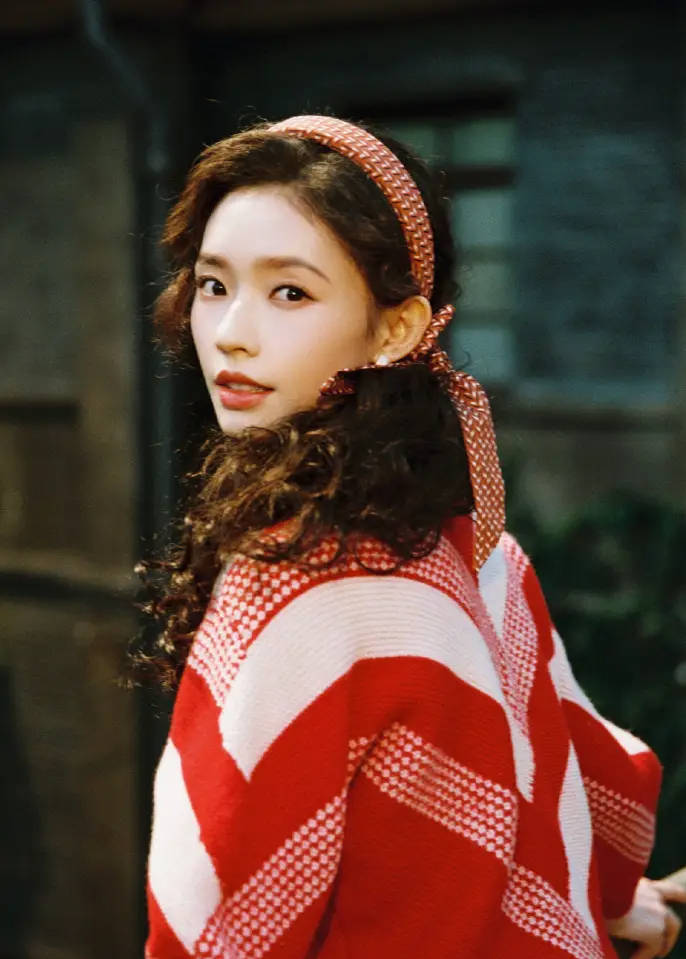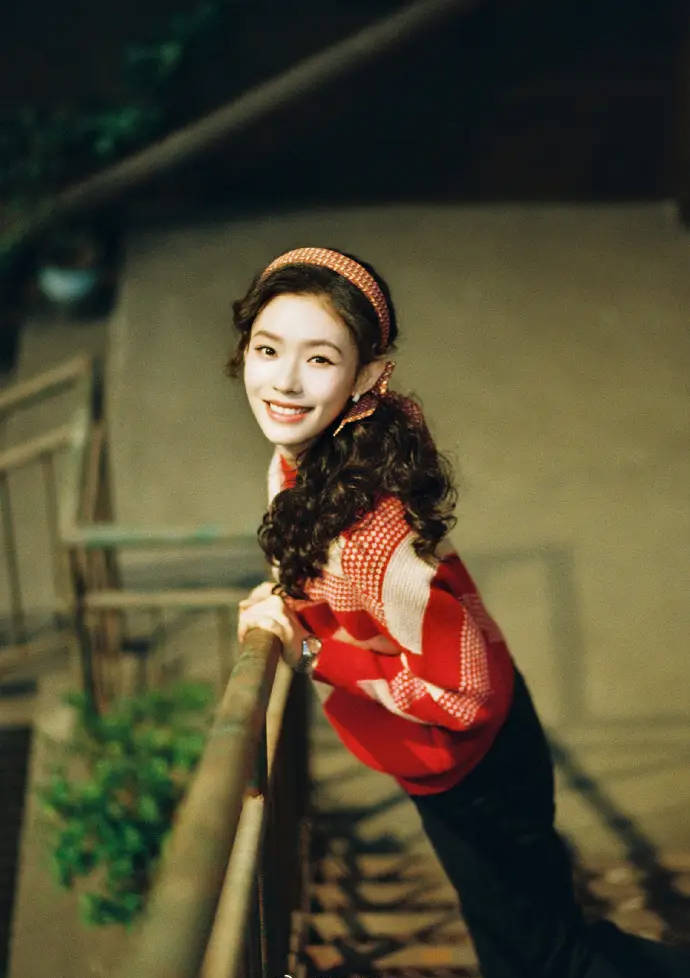 林允红色毛衣配卷发年代感拉满。