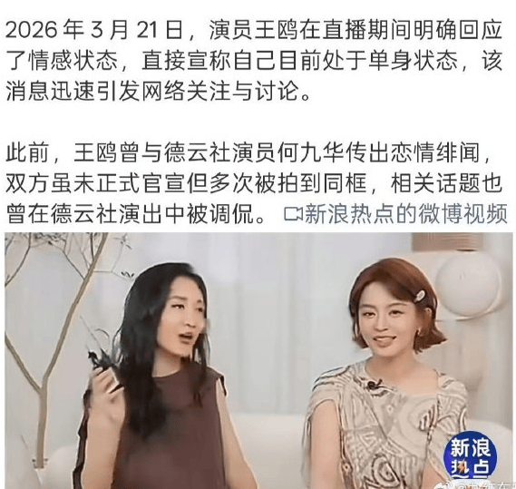 2026年3月21日,演员王鸥在品牌直播互动中首次正面回应情感状态,直接宣称“我也是单身”,并强调单身生活“很自在从容,不需要牵挂谁”,一举终结了与德云社演员何九华持续近五年的恋情传闻。