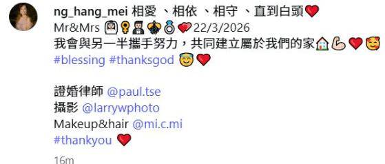 今日,吴幸美正式在社交平台公布喜讯,正式荣升人妻,她表示:“相爱、相依、相守、直到白头,我会与另一半携手努力,共同建立属于我们的家。”