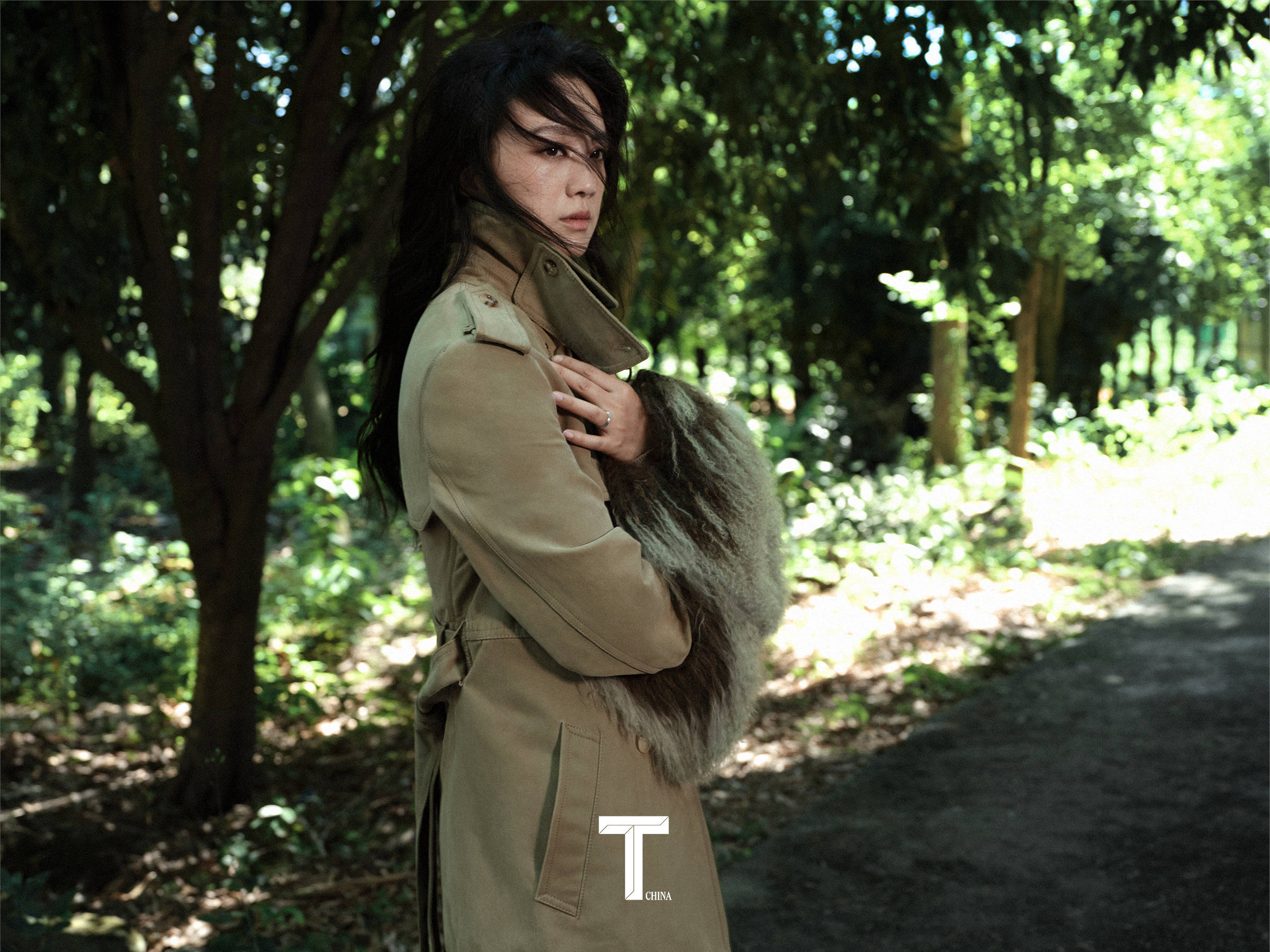 汤唯穿卡其色大衣,气质优雅。