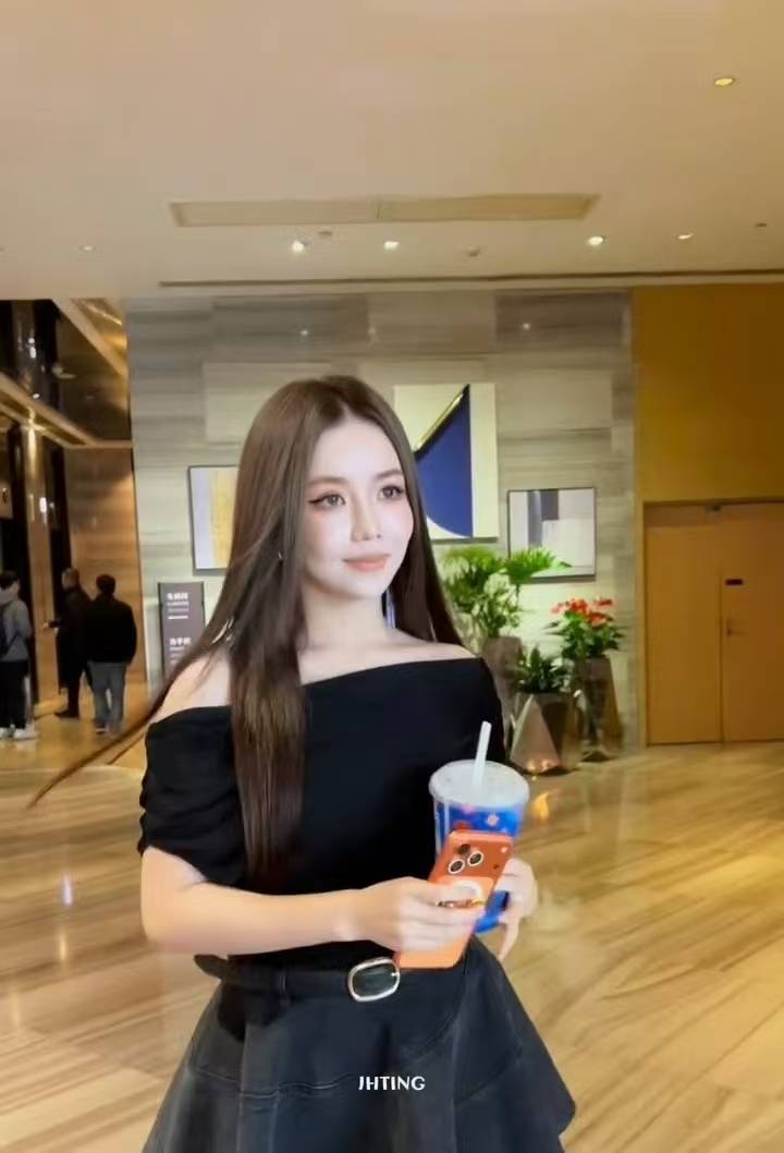 安崎穿黑露肩裙,持饮品甜笑灵动。