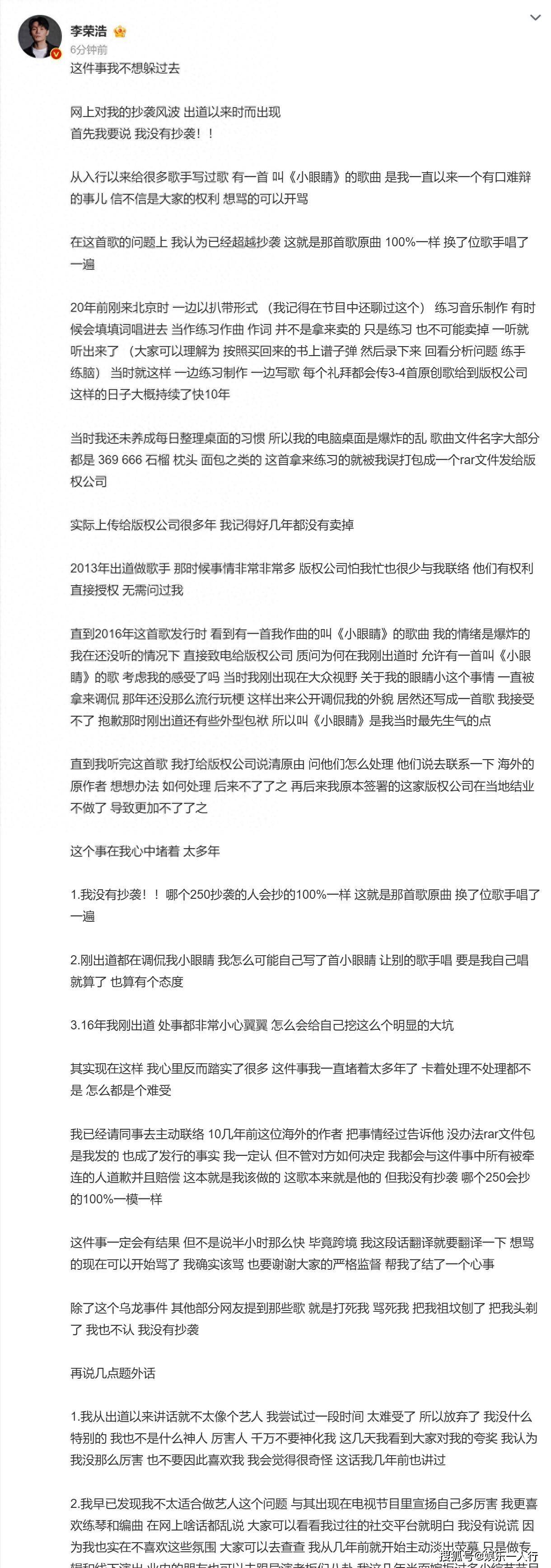 “李荣浩:抄歌一时爽,一直抄一直爽,直到被自己人背刺!”