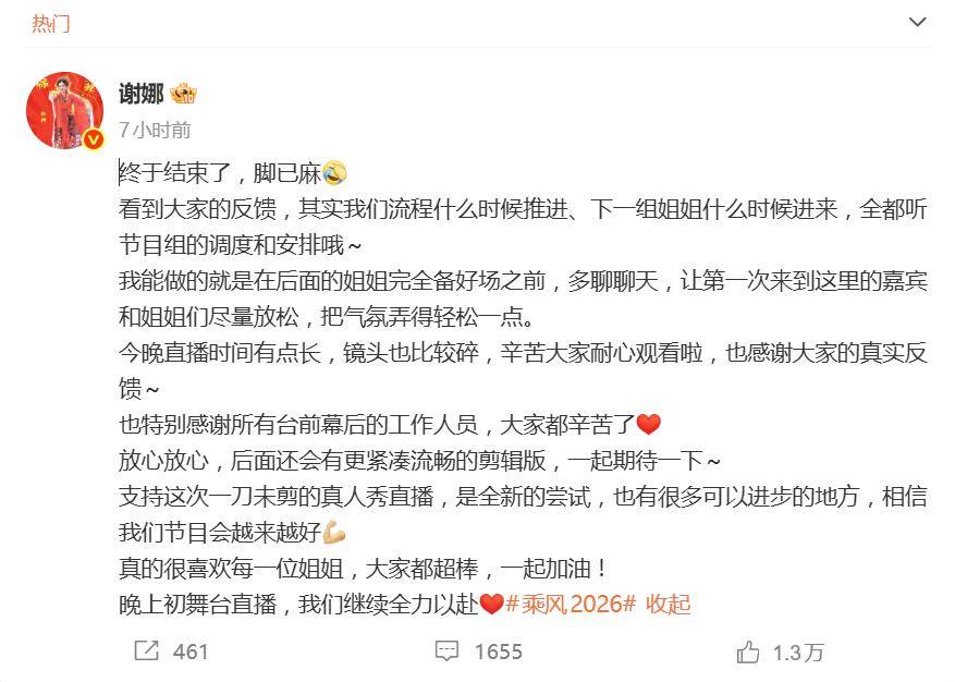 同时,谢娜也给出了后续的“定心丸”:她透露后面会有“更紧凑流畅的剪辑版”供大家期待。在回应中,她肯定了这次“一刀未剪”的真人秀直播是一次“全新的尝试”,承认有“可以进步的地方”,并表达了对节目越来越好的信心。文末,她不忘为所有姐姐加油,并预告将全力以赴迎接晚上的初舞台直播。