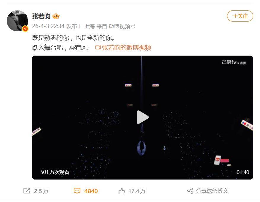 当晚,张若昀用行动给出了最浪漫的支持。他在社交媒体发布妻子的舞台视频,并配文:“既是熟悉的你,也是全新的你。跃入舞台吧,乘着风。”这既是对她过往的认可,更是对她重启征程的喝彩。