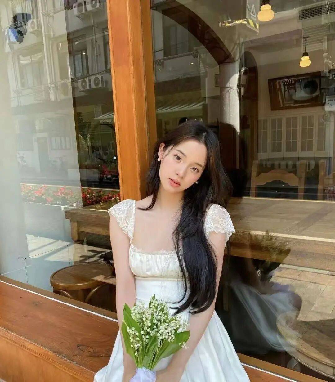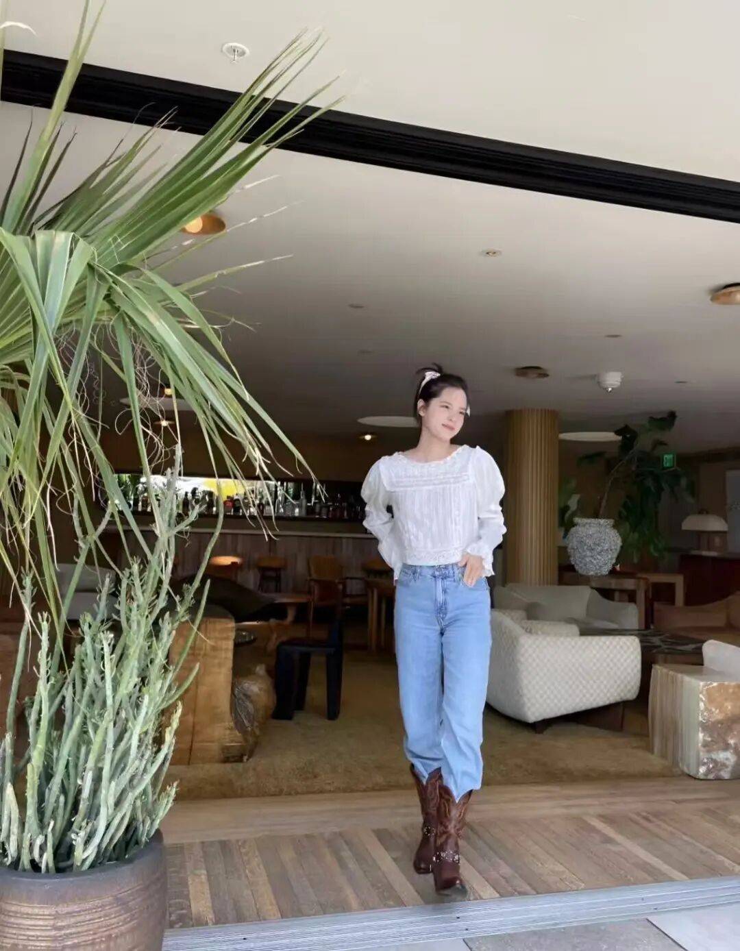 素素的,好漂亮,好白开水的一套,法式蕾丝白衬衫+水蓝色牛仔直筒裤,这种穿搭真的就适合这种淡淡的伪素颜妆容,衬托出好气色就好啦!我觉得头上的粉色蝴蝶结丝带装点得刚刚好,真的是无忧无虑的少女气息。