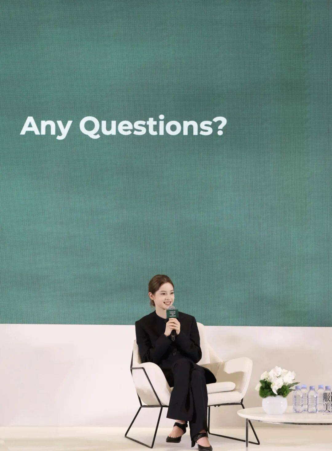 论坛会议上,一套规规整整的黑色西装套装,搭配盘发低丸子头,干干净净,干练又高级,小小巴掌的脸上尽是温柔和镇定。