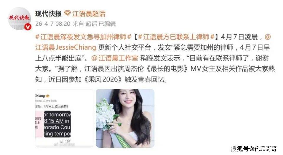 不过,复出之路并非一帆风顺。2026年4月7日凌晨,正在长沙录制《乘风2026》的江语晨突然紧急发文求助,寻找能在加州时间当日早上8:30前出庭的律师,还附上了美国法院的排期截图,语气中满是急迫,疑似遭遇跨国子女抚养权或探视权相关的紧急诉讼。据悉,此次纠纷大概率是前夫趁她专注节目录制、身处国内的间隙发起的临时法律行动,中美15小时的时差以及密集的录制行程,让她陷入两难境地,而加州法院要求出庭律师必须持有当地执业资格,更让这场紧急求助雪上加霜。