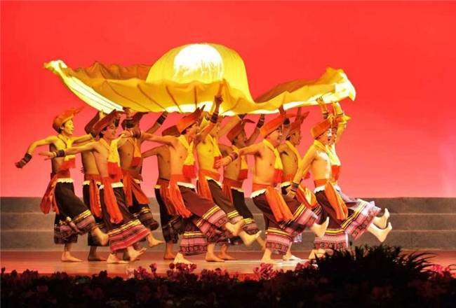 如果说《接龙桥》是家国信仰的磅礴礼赞,《情妹找到少年郎》是人间情爱的细腻描摹;那么《太阳大得很》便是男性气魄的巅峰展现,以雄浑开阔的精神象征,续写夏冰道具美学的精神内核。这部作品出自2011年夏冰任总导演的大型音舞诗画剧《金那银儿梭》,该剧参加湖北省少数民族歌舞调演获剧目大奖,《太阳大得很》与《嗯呐嗯》分获特别奖。
