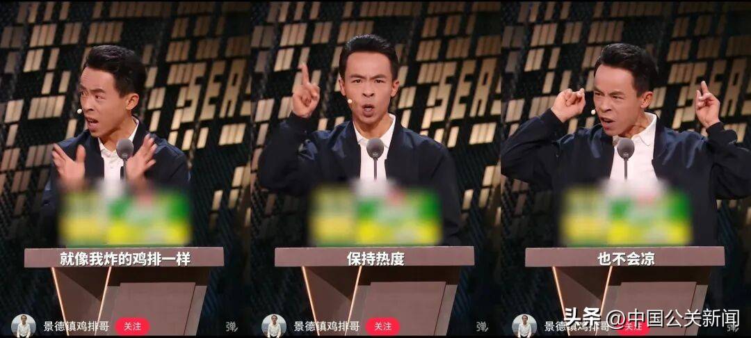 后来金句越来越多,简直是互联网的嘴替:鸡排免费,塑料袋6块。、不炸到位,我不能原谅自己。、辣椒我花钱买的,不会给你放太多。网友戏称:6元鸡排,买到了600元的情绪价值。更绝的是,网友将他忙中有序的动作剪成二创视频,做完你的我做你的,成了打工人精神状态的最佳代言。 他坚持十三年不涨价,每天切新鲜食材,勤换炸油,拒绝预制菜。对学生还优惠一元,下午四点半后优先接待学生。这种市井里的真诚,在流量时代极为稀缺,因此他火了。粉丝短时间破百万,摊位前排起百米长队,有人跨省打卡,只为听他喊一句袋子给我。但随之而来的是流量的反噬:一天只睡三四个小时,被围堵到墙角喊我都要窒息了,连休息一天都得发视频道歉。国庆期间,他累出全网疯传的痛苦面具,那表情比任何脱口秀段子都好笑,也更令人心酸。热度来得快,退得也不慢。可就在大家以为他会被淹没时,他接过了景德镇文旅推介官的证书,拖着油锅开启全国巡炸。从南京炸到郑州,从武汉炸到福州,所到之处万人空巷。如今又站上综艺舞台,杀入娱乐圈,每一步都在接受更严苛的审视。有人说他变了,飘了;有人说他没变,依旧是那个不怯场、有底气的掌勺岗。而鸡排哥在综艺上早已把话说透:希望各位老师的事业像我炸的鸡排一样,保持热度,永不掉粉,既不会糊,也不会凉。