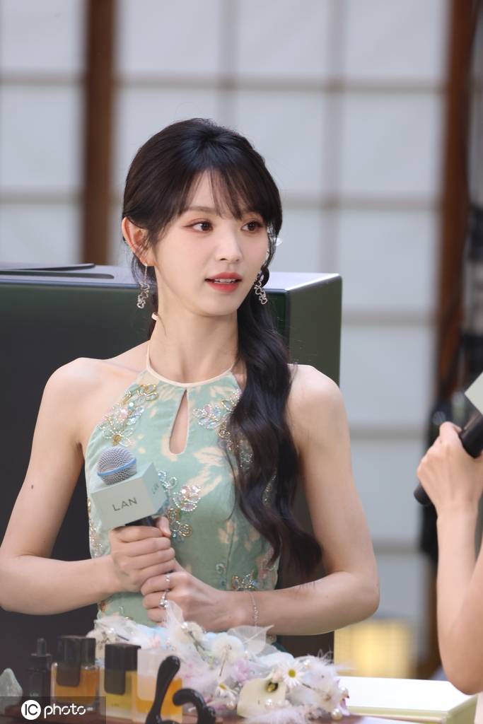 田曦薇身穿天青色花苞裙,完美诠释东方雅韵。