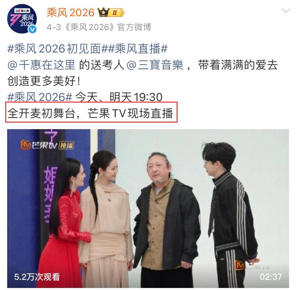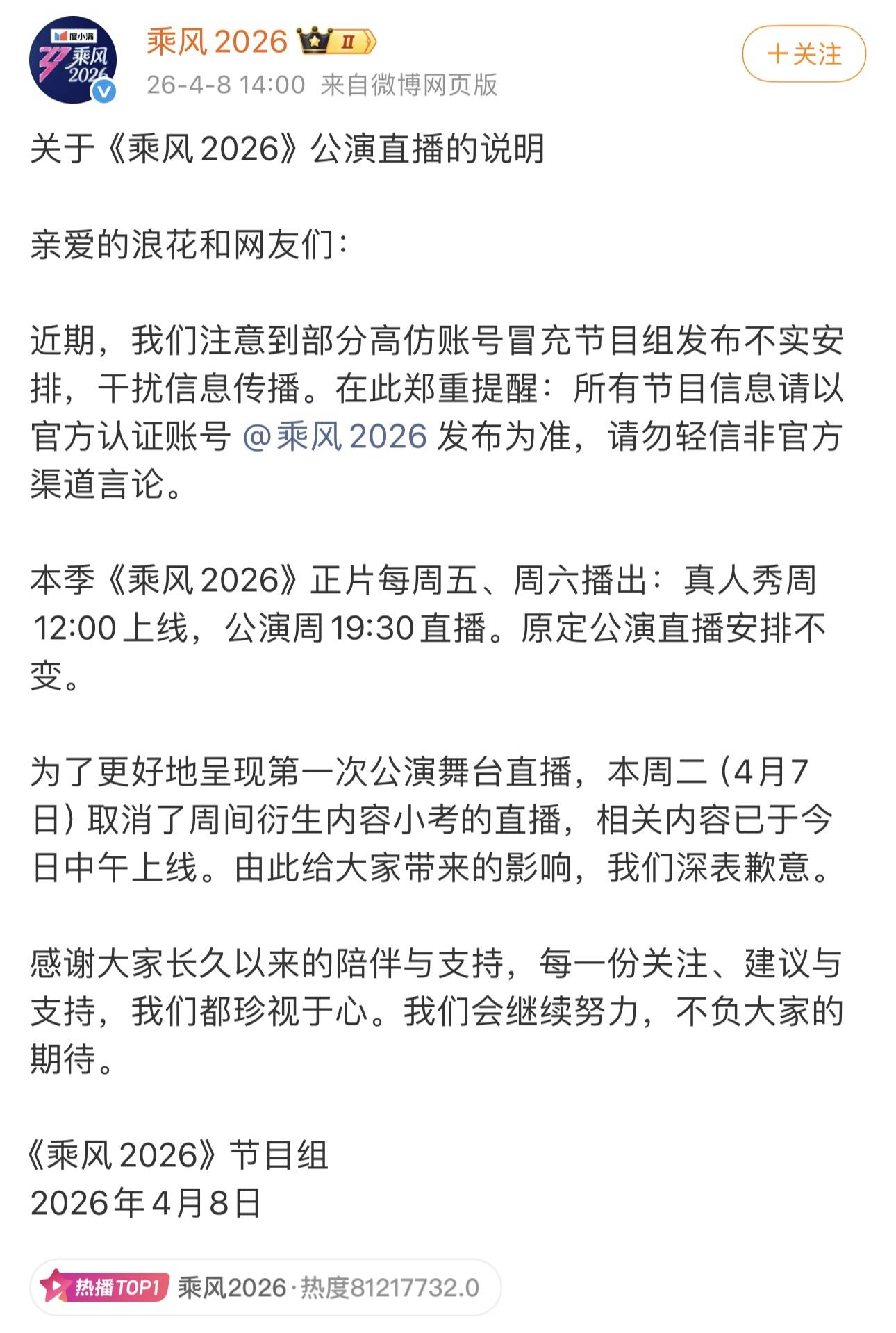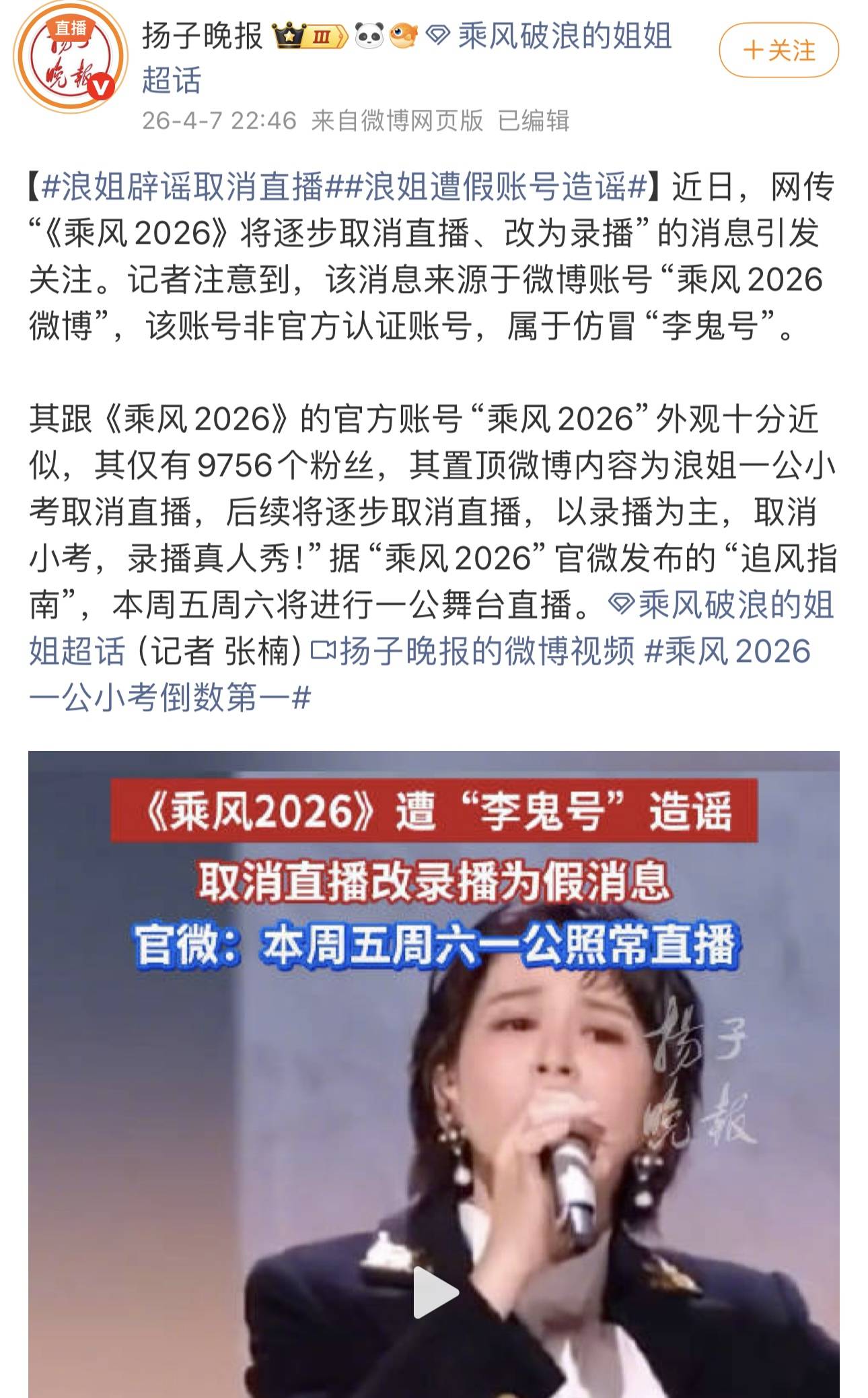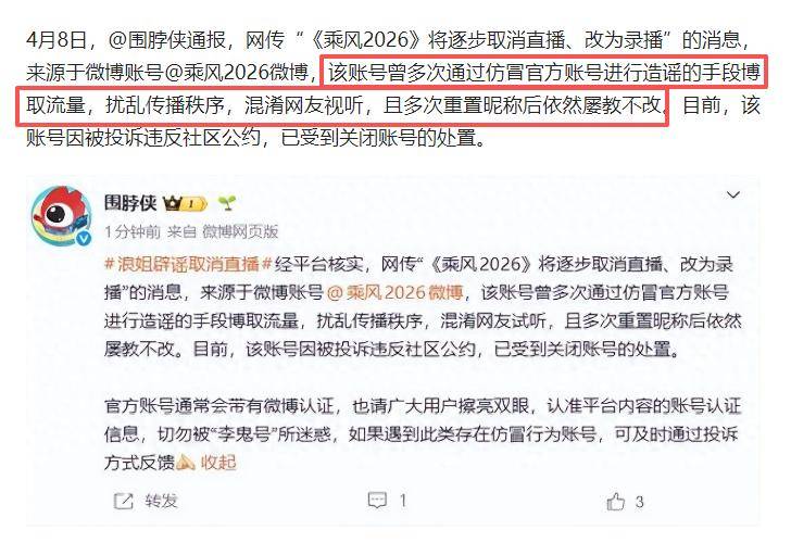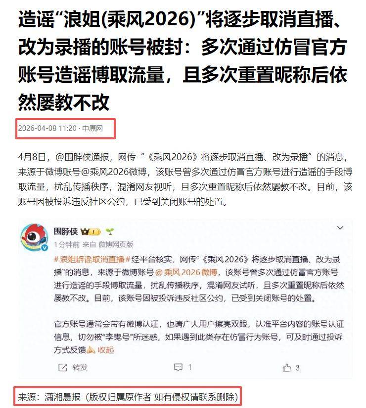 有账号冒充《乘风2026》官方账号,在网上传播“《浪姐7》将逐步取消所有直播,后续全部改为录播”等不实信息。