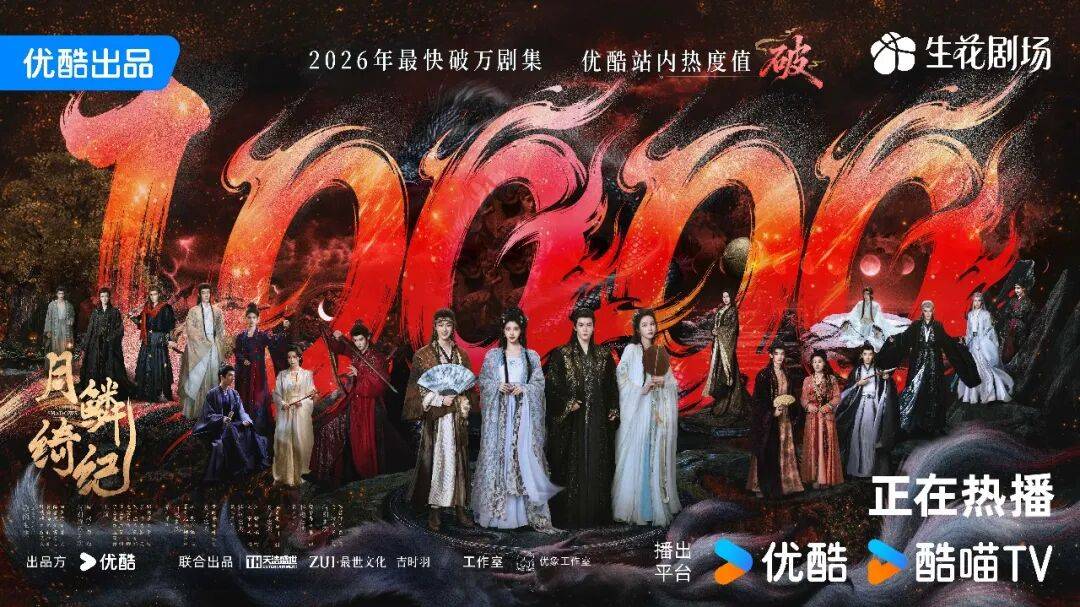 4月3日,在优酷独播的古装奇幻爱情剧《月鳞绮纪》开播52小时后站内热度破万,成2026年最快破万剧集。