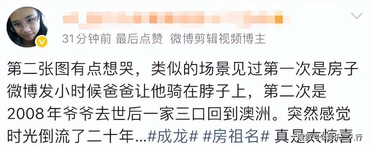 最戳人的一幕发生在苏东坡祠。逛累了,父子俩找了一棵大树根坐下休息。成龙很自然地抬起左手,搭在儿子的右肩上,右手指着远处的风景,侧过头跟房祖名说着什么。房祖名微微倾身听着,帽檐下的表情看不太清,但那种放松和接纳的姿态,是装不出来的。有网友翻出了房祖名小时候骑在爸爸脖子上的老照片,和眼前这个画面一对比,让人瞬间恍惚。时间好像绕了一个大圈,又把这对父子送回了彼此身边,只是当年的小不点,如今已是个能并肩而坐的中年男人了。